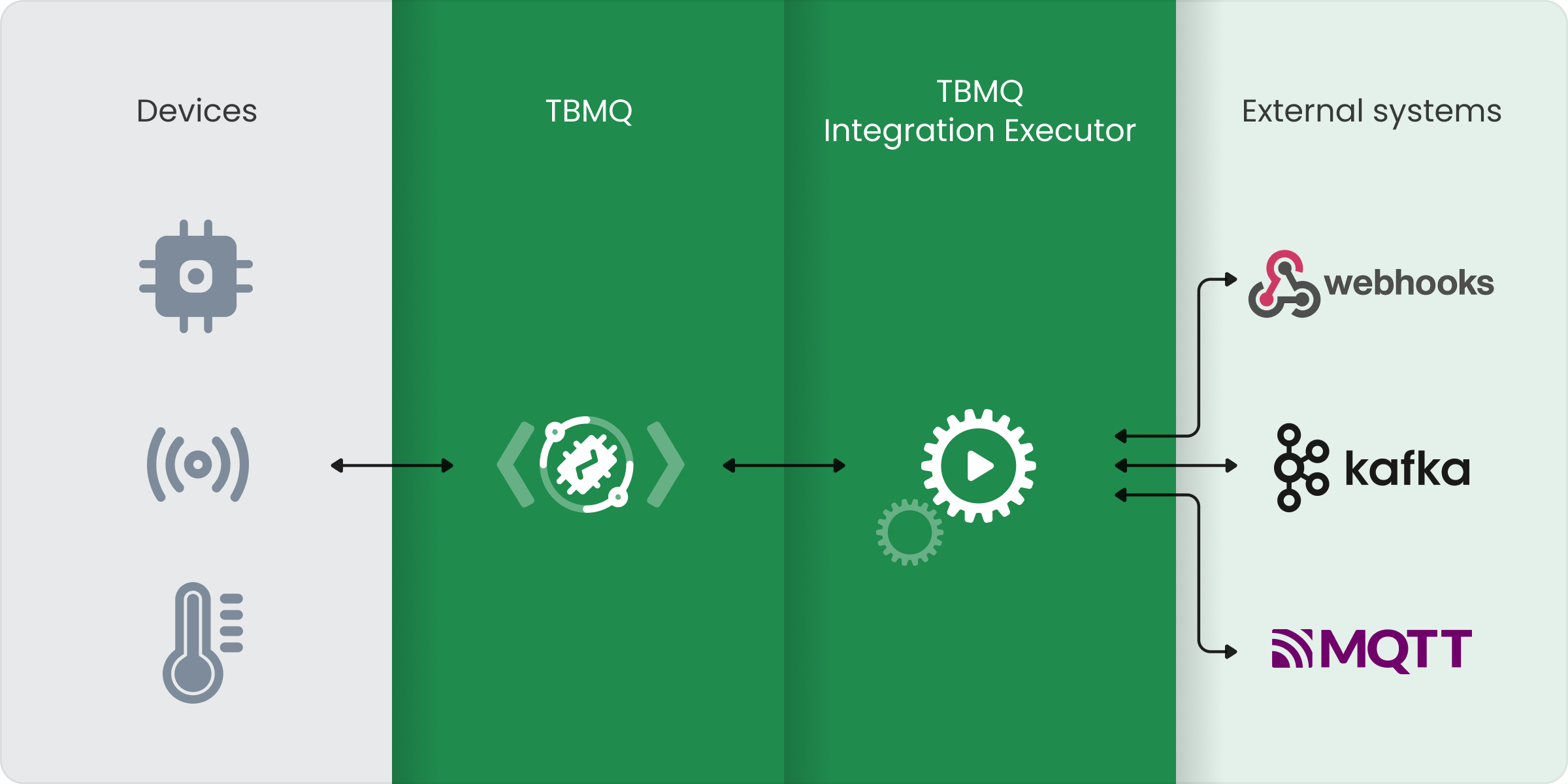 Rather than embedding integration logic inside the broker, TBMQ delegates this responsibility to the Integration Executor. This architecture ensures clean responsibility segregation, allowing the broker to focus on MQTT protocol handling while the executor takes care of message delivery to external systems. The result: better performance, isolation, and scalability.