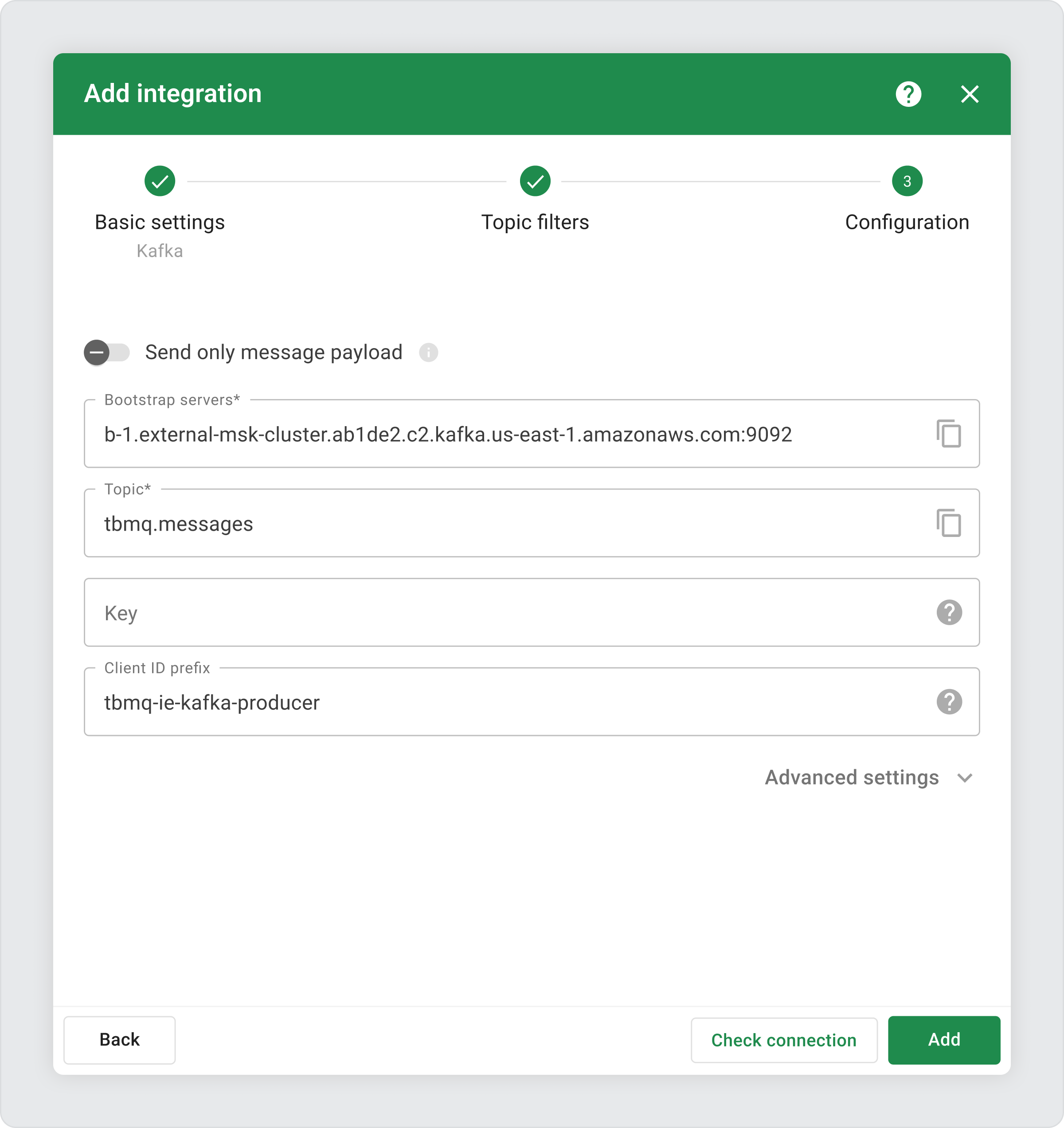 The Kafka Integration enables TBMQ to stream messages directly into Kafka topics using the Kafka binary protocol (TCP/TLS). It’s designed for high-throughput, event-driven data pipelines, and real-time processing.