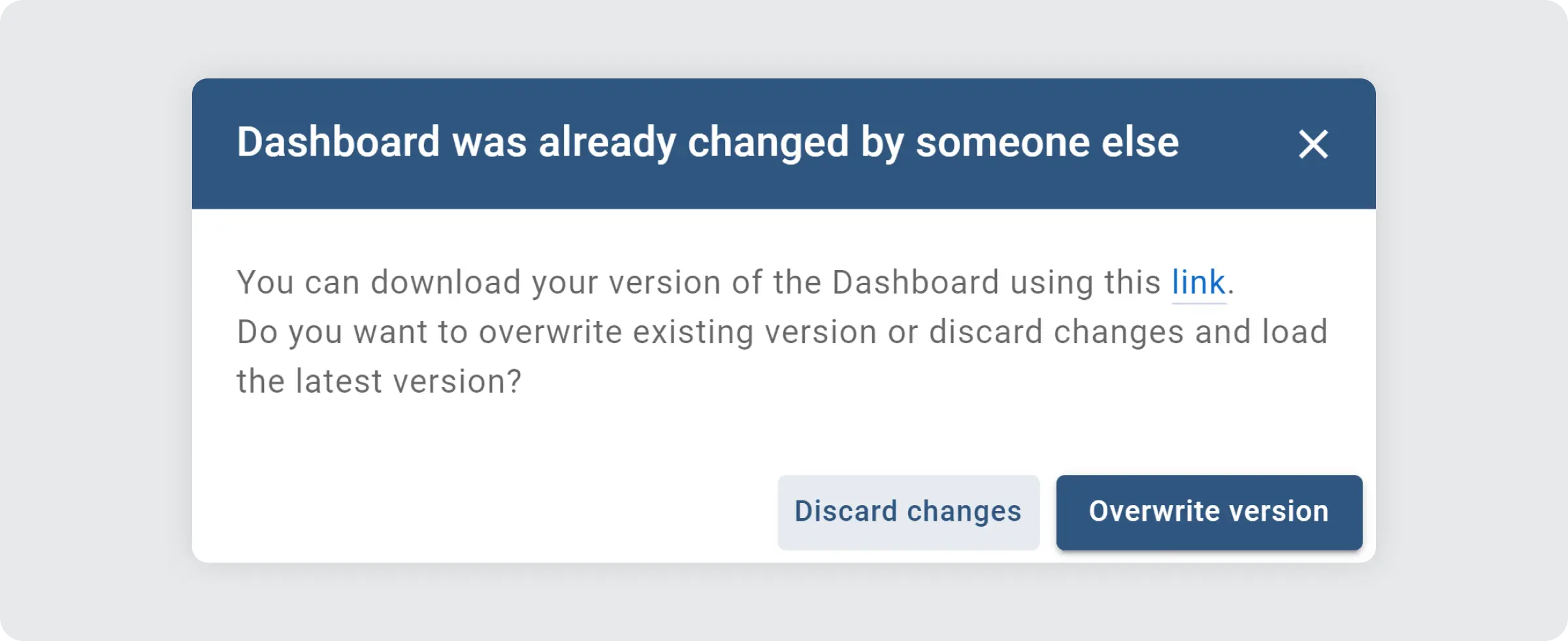 We’ve introduced a new feature to manage simultaneous editing on dashboards. Now, if two or more users are working on the same dashboard, you’ll be notified when someone else has already made changes. You can then overwrite the other user’s updates with your own changes or discard your modifications. But don’t worry—you can still download your latest dashboard version before discarding the changes, ensuring your work is saved without losing any updates. This feature improves collaboration, prevents accidental data loss, and gives you full control over how changes are managed.
