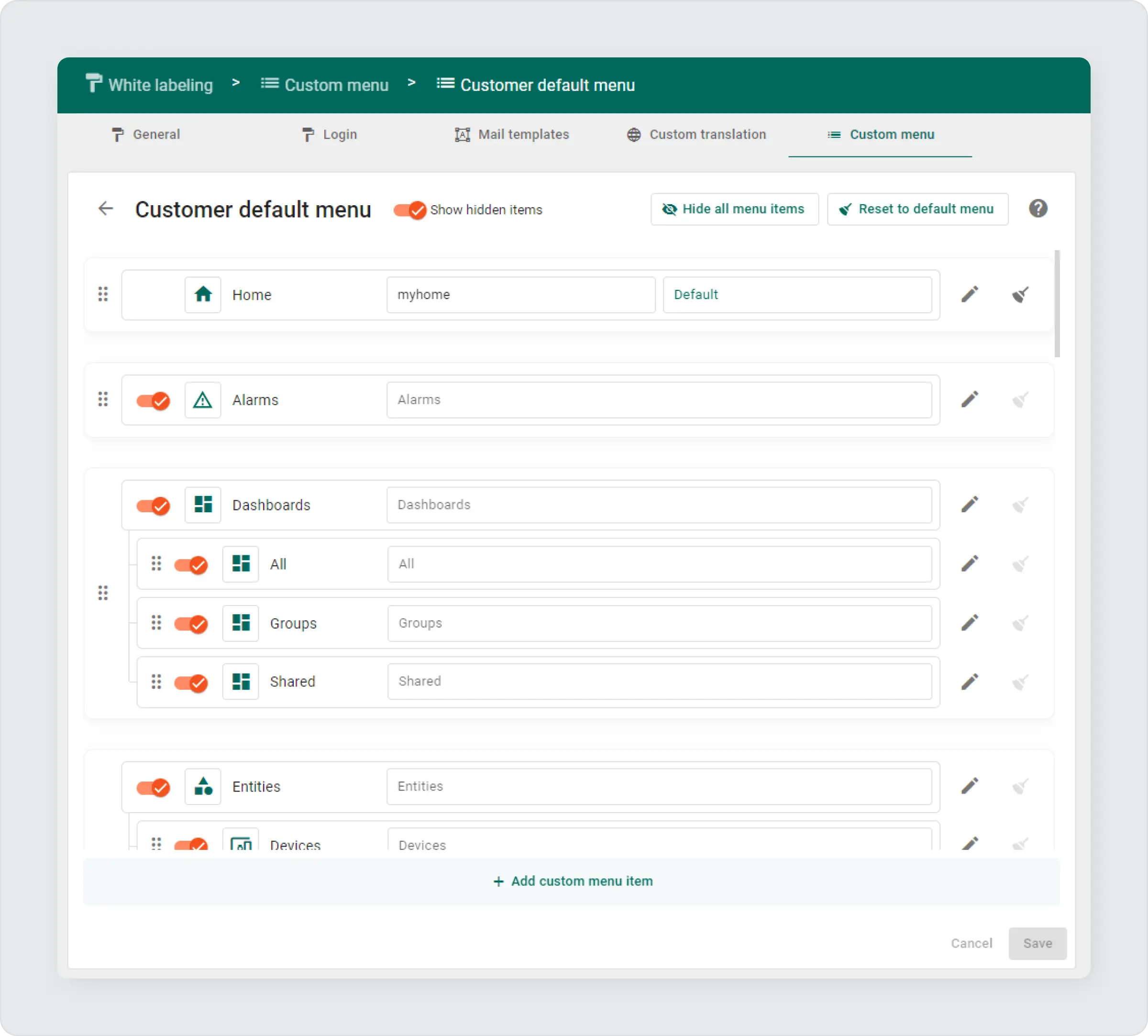 The latest update simplifies the process of adding and editing menu items using the convenient Web form instead of plain JSON. We’ve enhanced the user experience for existing functionality and introduced new features for more flexible customization. Now, you can create Сustom menus for different scopes (System, Tenant, Customer) and assign each menu to a specific Customers or Users list. Furthermore, the new Custom menu configuration allows you to arrange the order and contents of sections, as well as add custom icons with just a few clicks.
