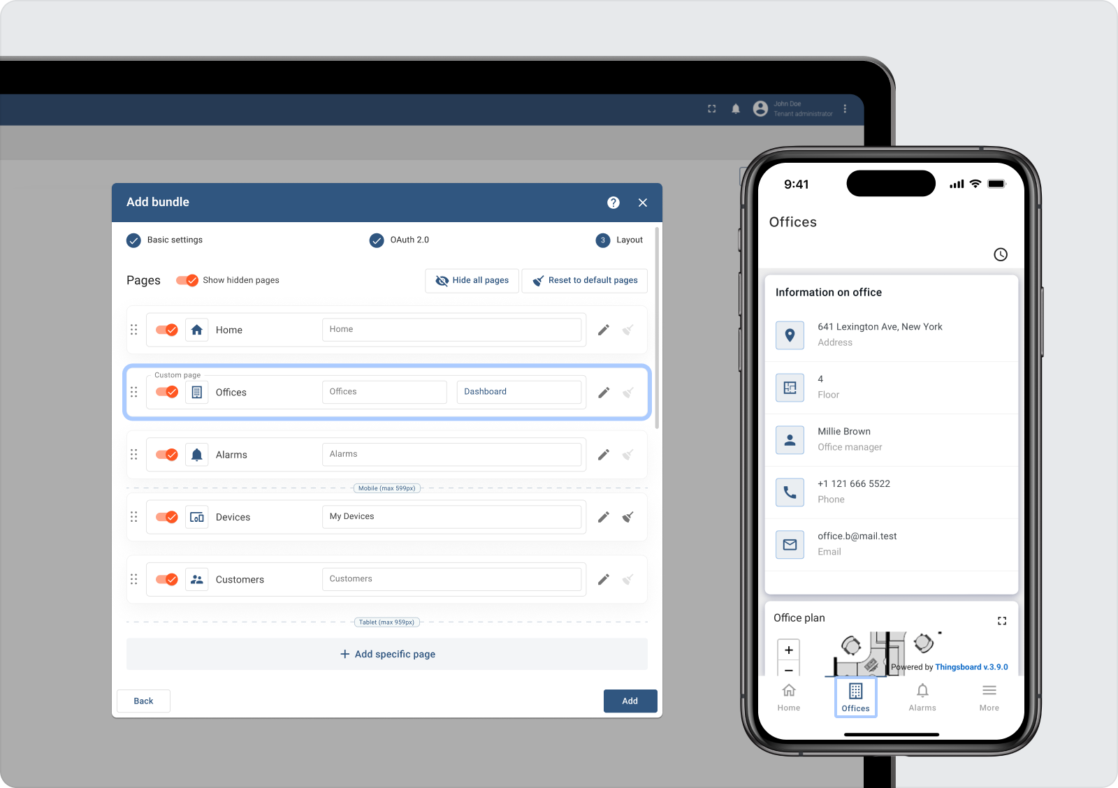 The Layout step enables you to personalize the bottom menu bar by rearranging and modifying the content of the pages. You can choose to hide some default pages from the end users and even add your own custom page to display a specific dashboard.
