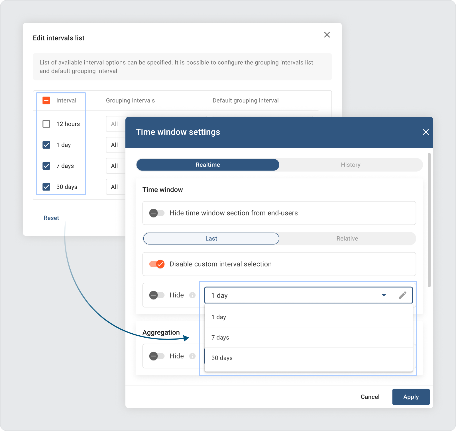 We’ve enhanced the Time window functionality to give dashboard developers greater control. You can now restrict the visible time intervals, aggregation functions, and grouping intervals available to dashboard end-users. This update ensures more precise control over the time window settings that end-users can access.