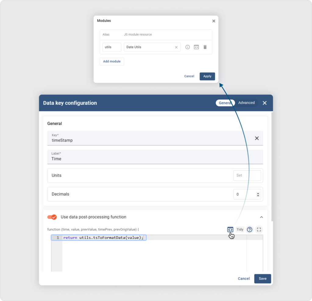 Once a module type JavaScript resource is added, you can reuse this code in any JavaScript editor within the platform, such as data post-processing functions, cell content functions, and custom actions. To do this, simply click on the “modules” icon, select your JS module, provide an alias, and then use this alias in the JavaScript editor to reference your module. Below is a simple example: