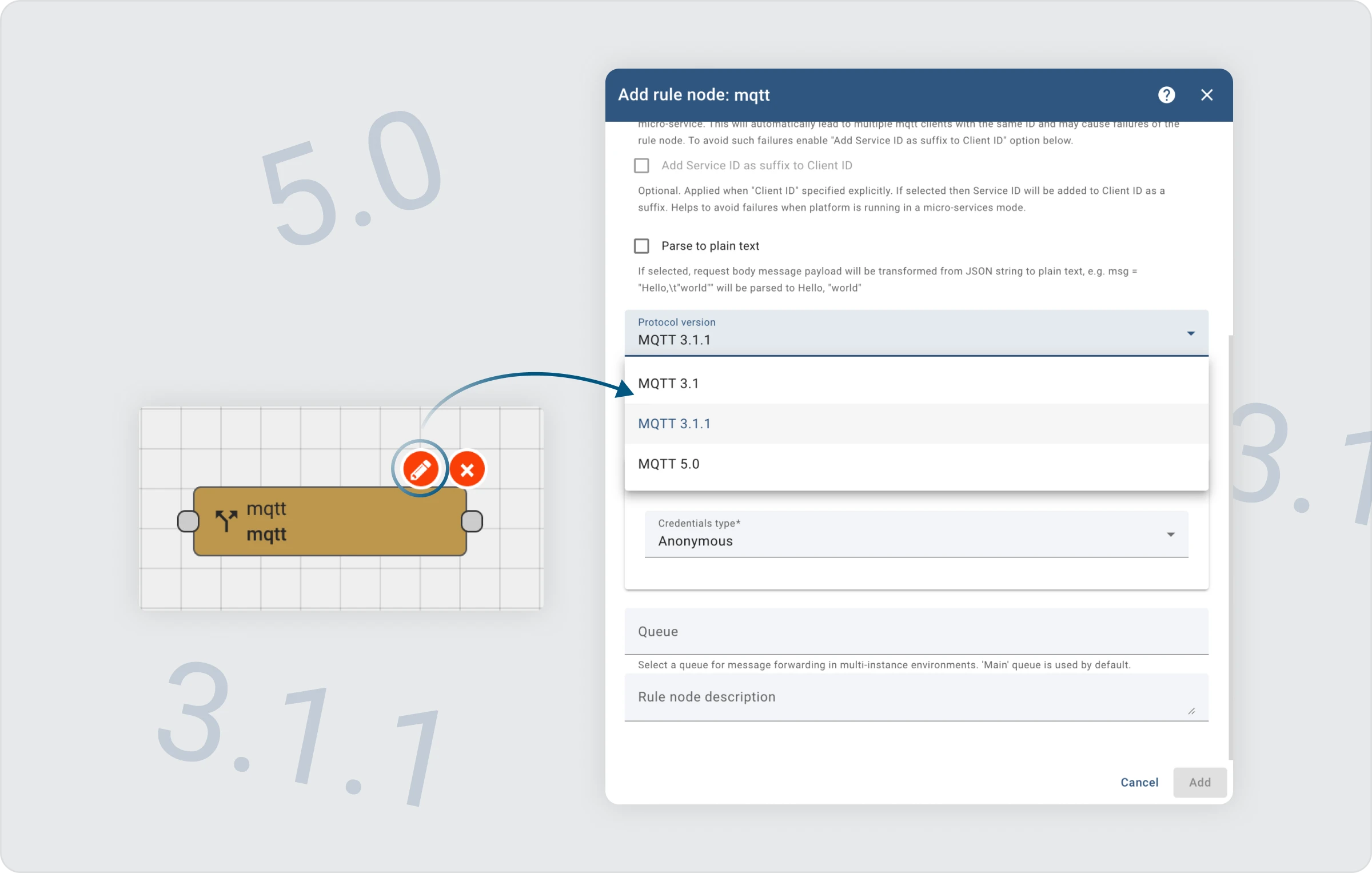 ThingsBoard 4.1 adds support for all current versions of the MQTT protocol — 3.1, 3.1.1, and 5.0 — in both Rule Engine nodes and Integrations.