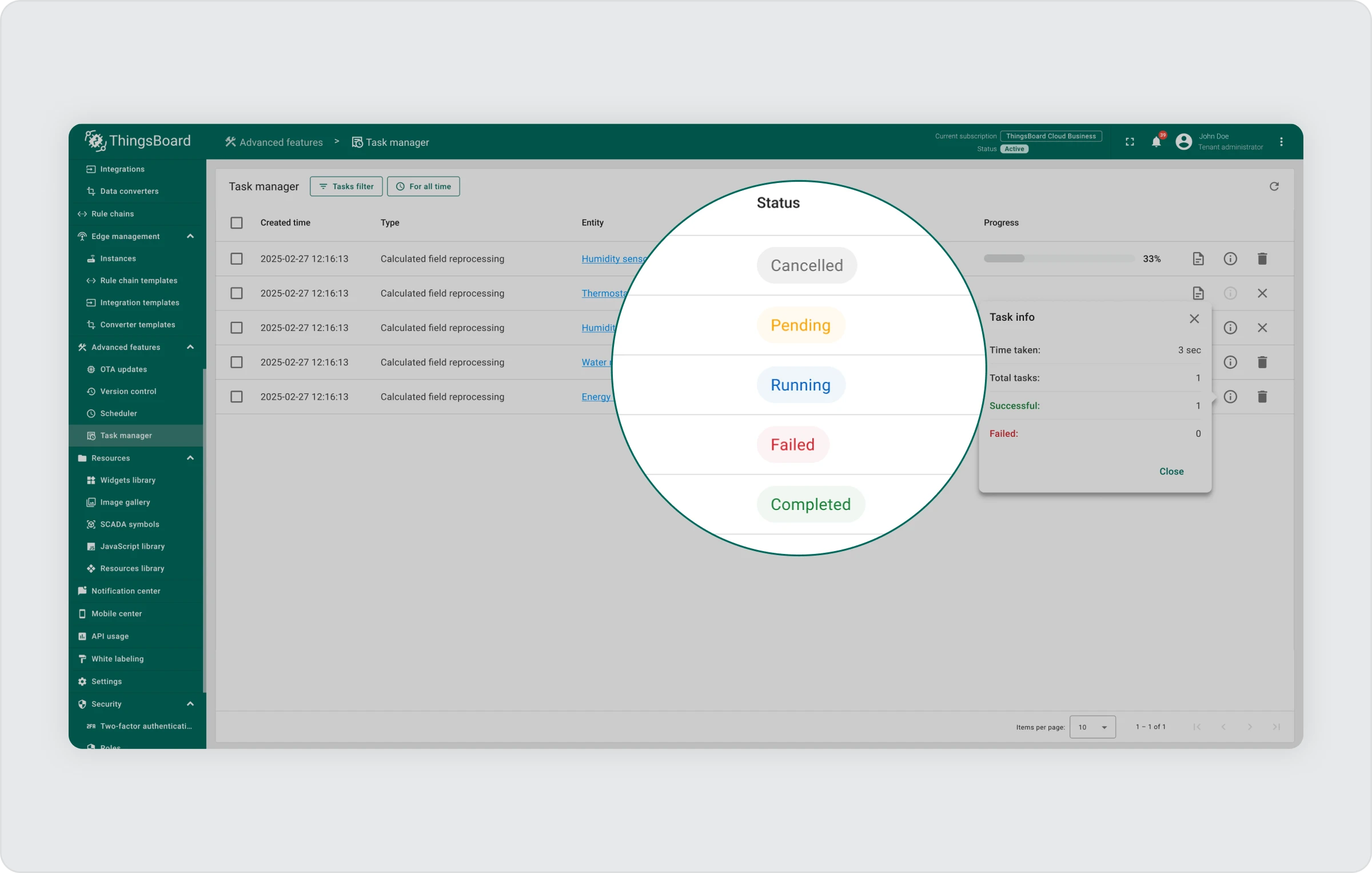 ThingsBoard 4.1 introduces the Task Manager — a centralized tool for tracking and managing background tasks from the UI. The first supported task is Calculated Field Reprocessing. When triggered, a main task is created and split into subtasks per entity.