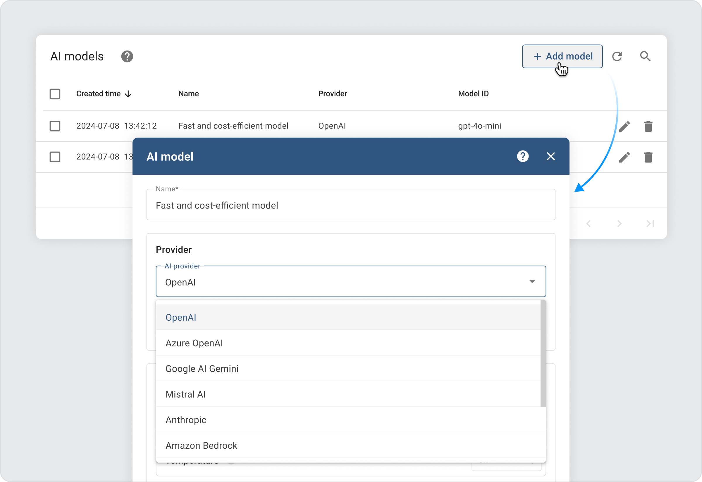 A new AI Models section under system settings lets administrators configure and manage connections to popular LLM providers. Out of the box, we support: