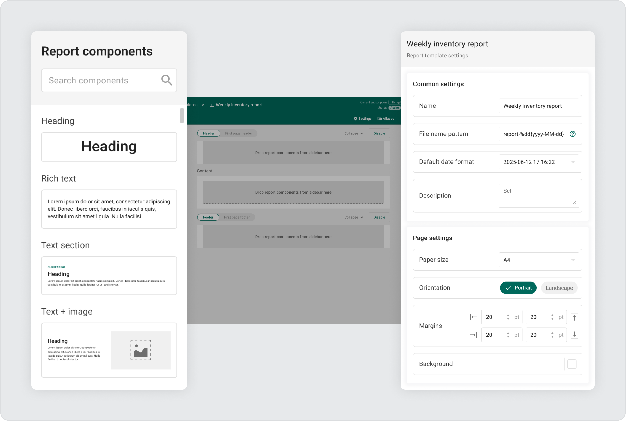 Creating a report starts with selecting the format (PDF or CSV) and the template type (Report or Subreport). Once selected, a visual layout editor becomes available, allowing you to drag components into the header, content, or footer sections of the page.