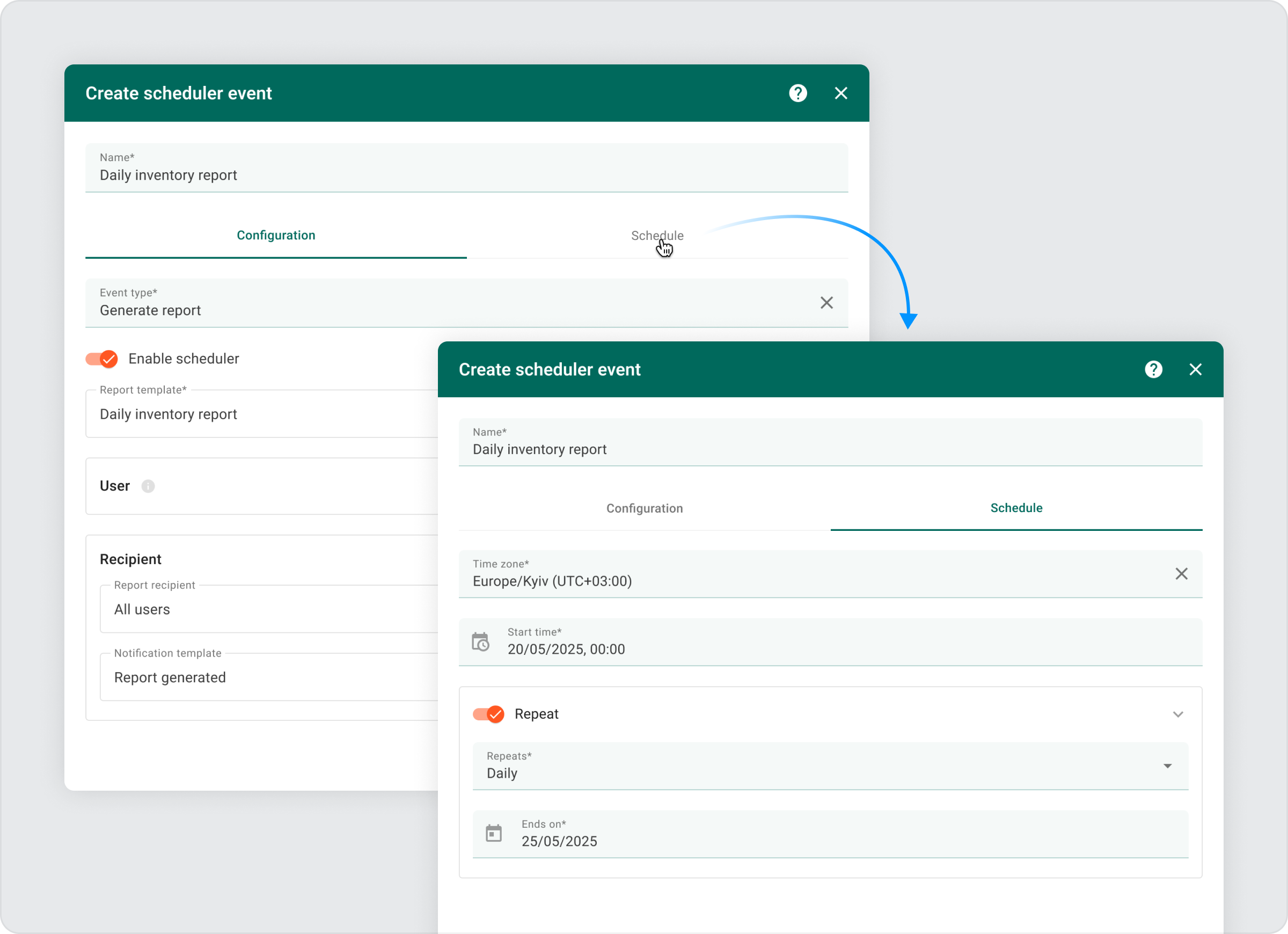 Once your template is ready, you can schedule automatic report generation using the Scheduler: