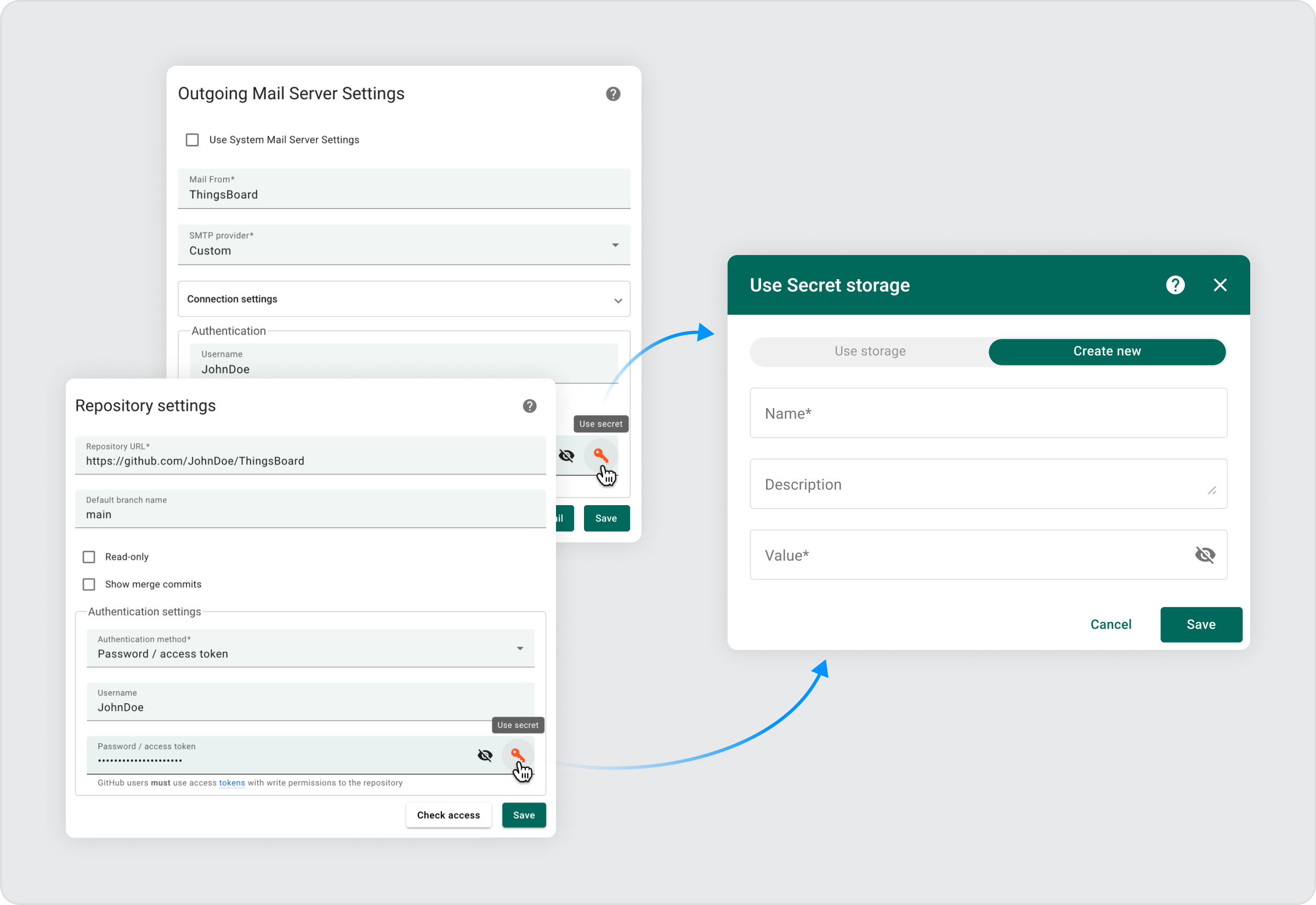 With ThingsBoard 4.2, secrets management has been extended to include system-level settings, allowing you to securely store and reference sensitive data such as: