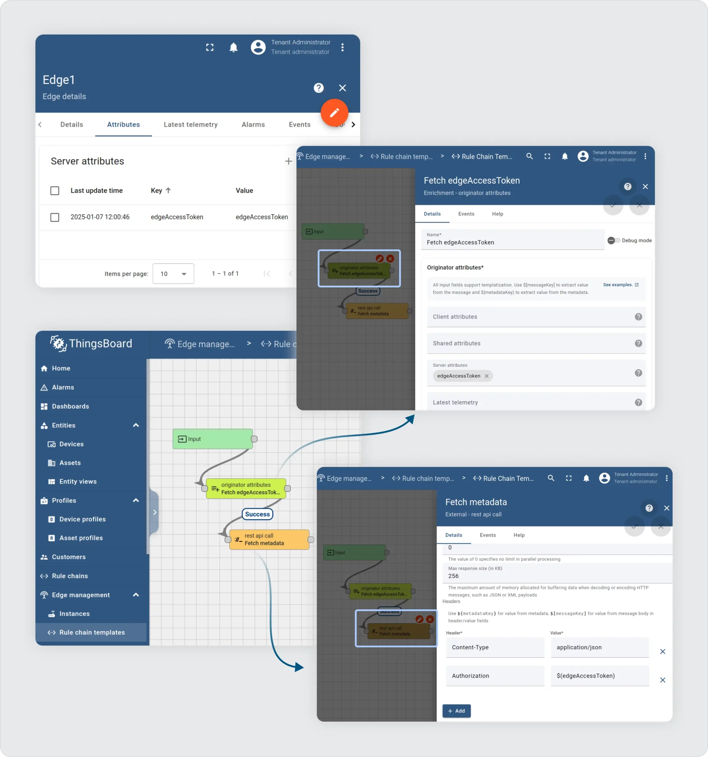From release 3.9.0 onward, you can also easily fetch Edge Attributes, such as configurations, access tokens, or metadata, and use them as placeholders in the Rule Chains.