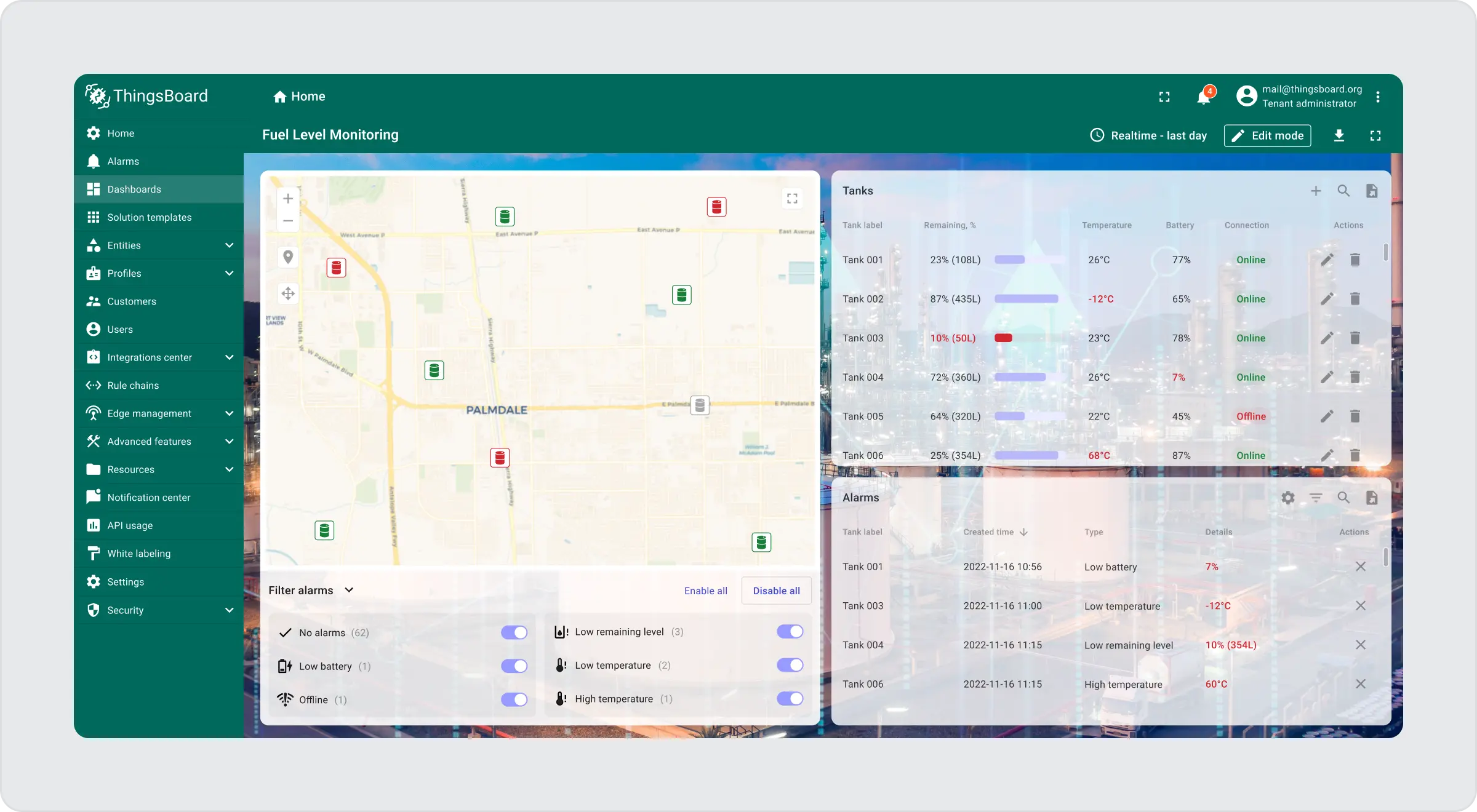 GET ACCESSHere is an overview of the main benefits of using an ThingsBoard IoT platform in the tank level monitoring: