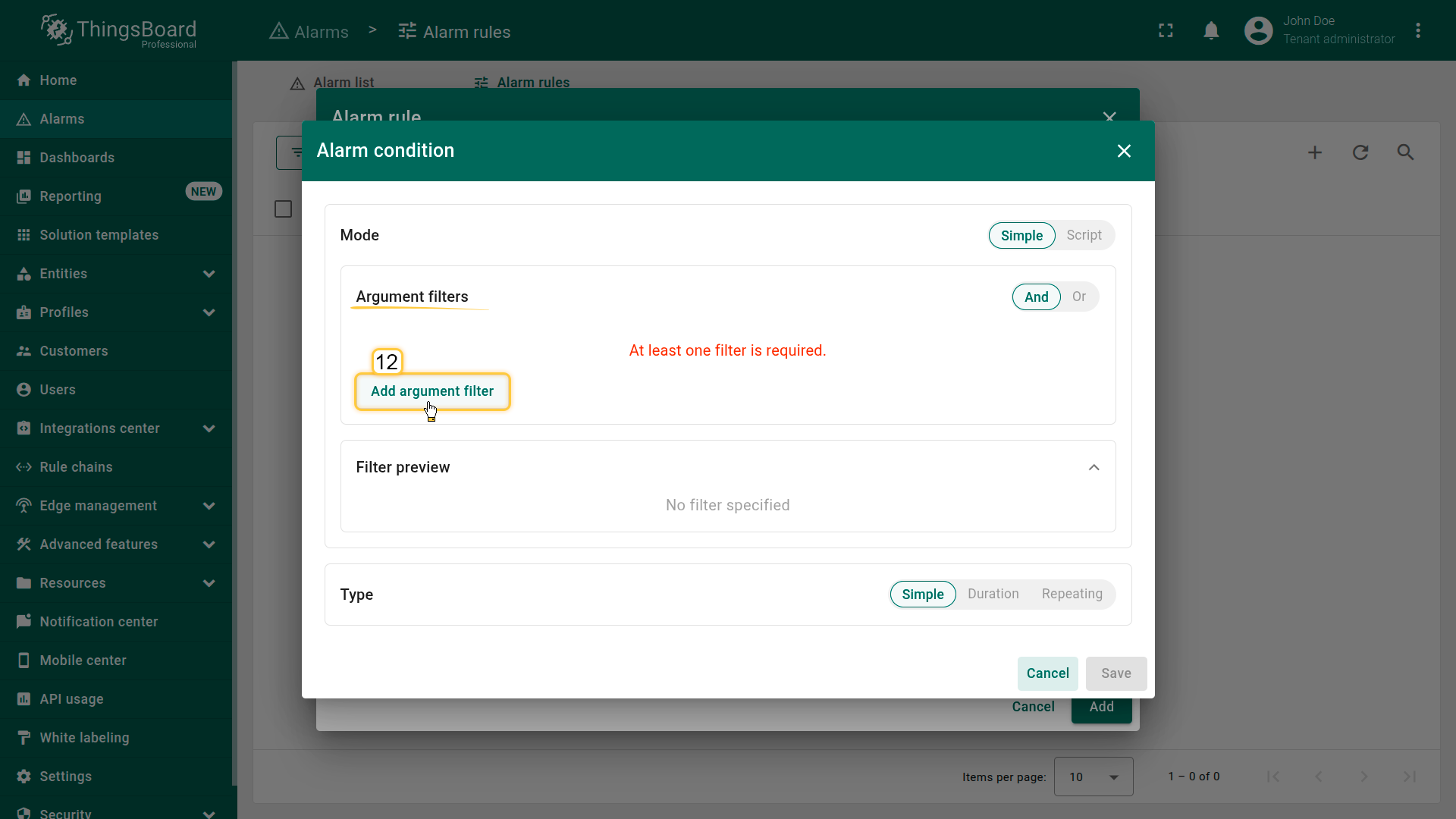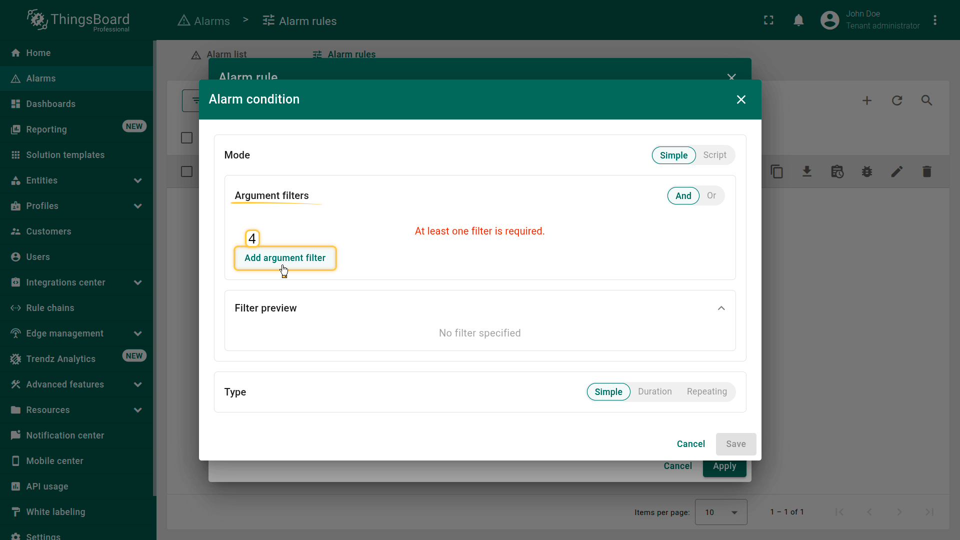 Configure the alarm trigger logic by defining one or more filters.