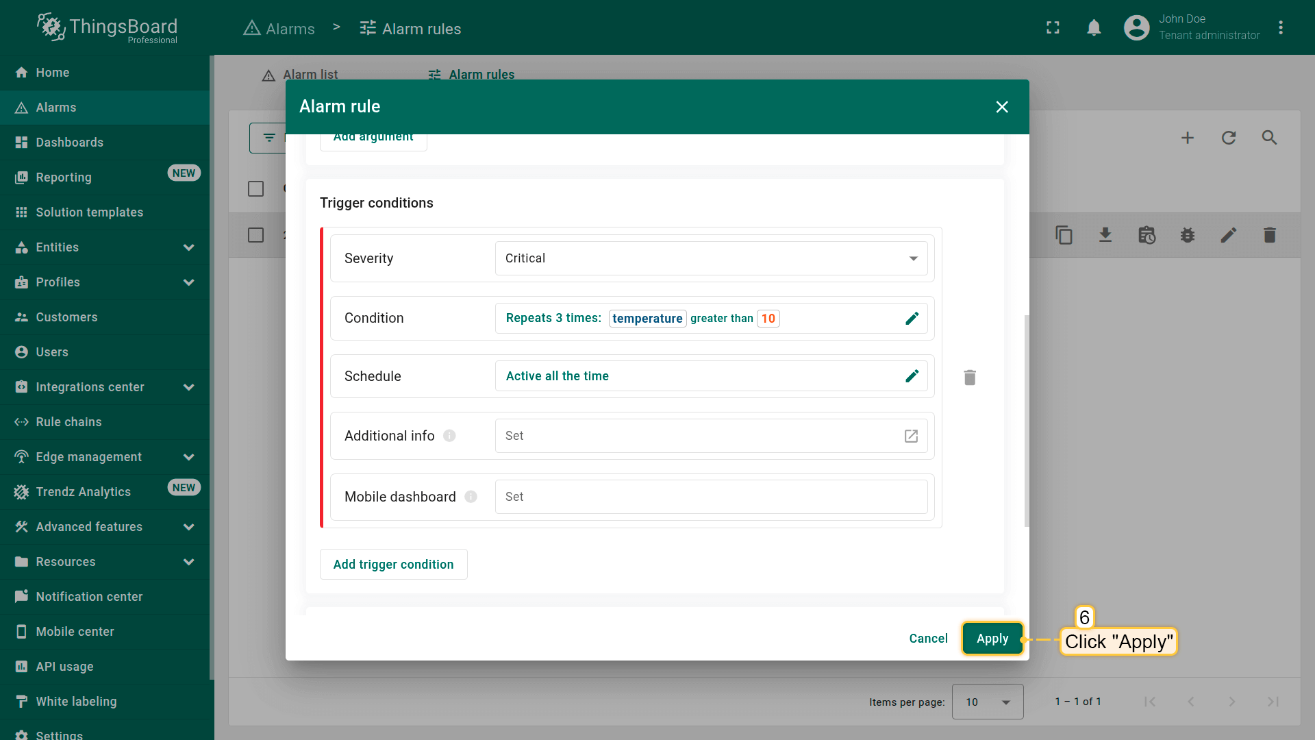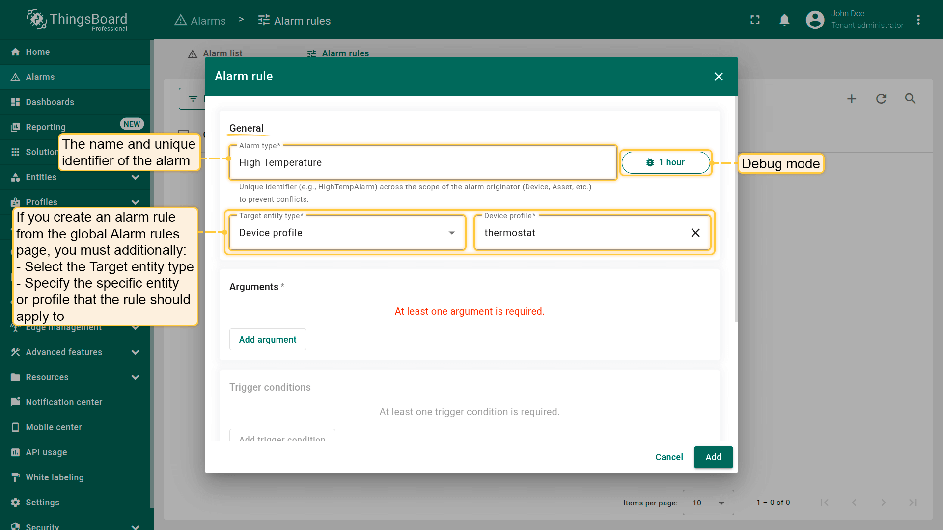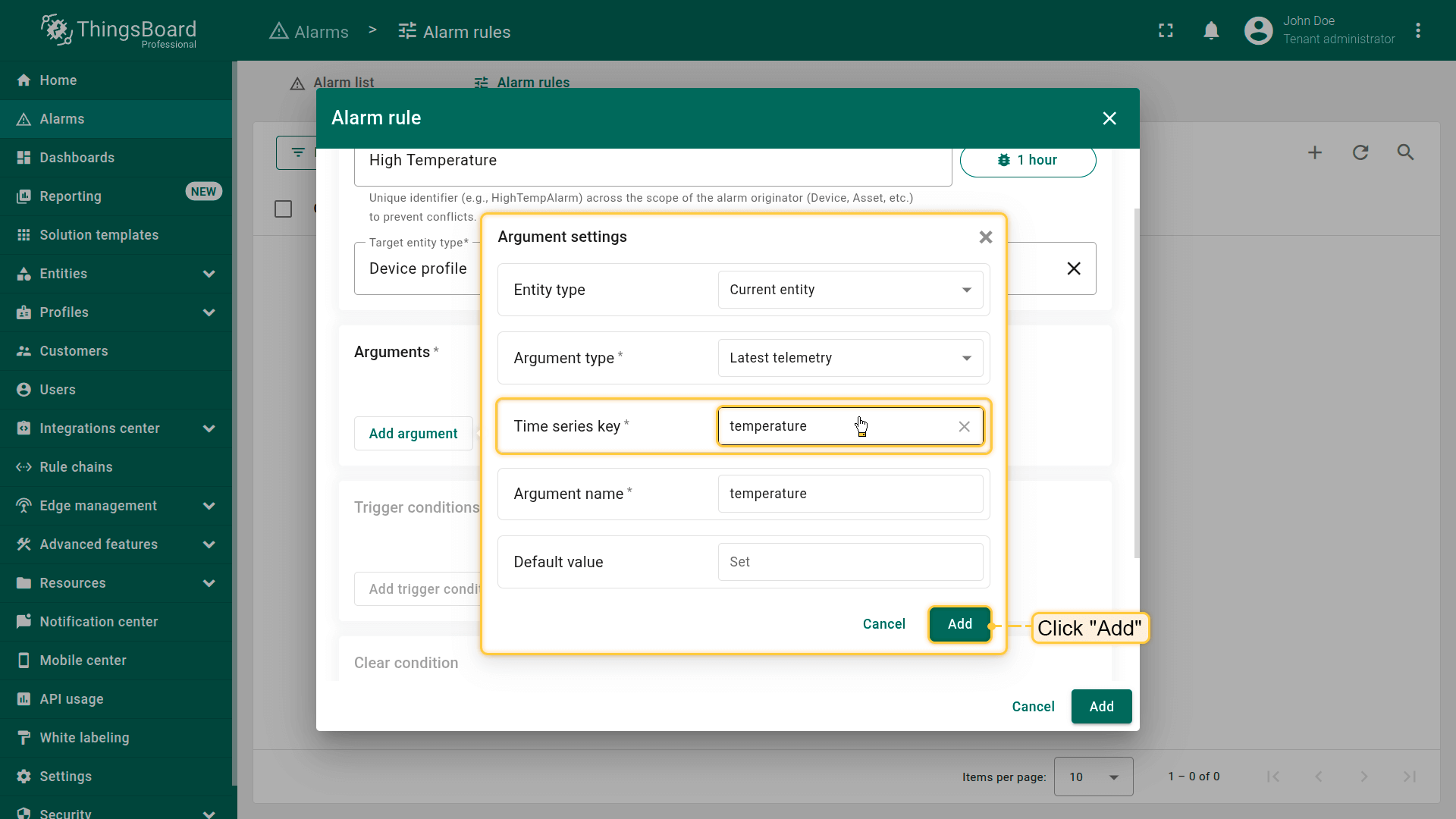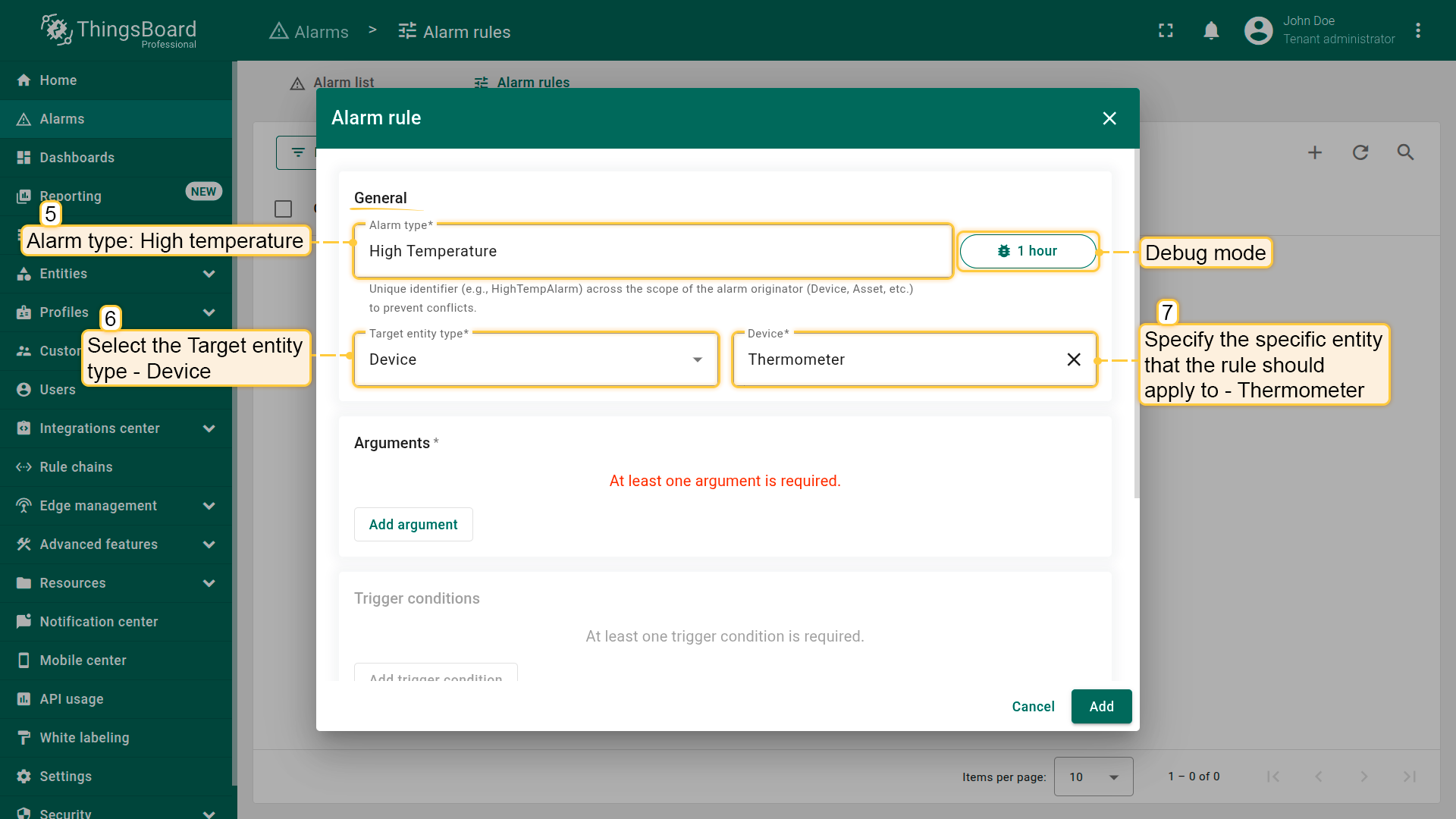 Note: The process of creating an alarm rule is the same for Devices, Assets, Device profiles, Asset profiles, or Customers.
