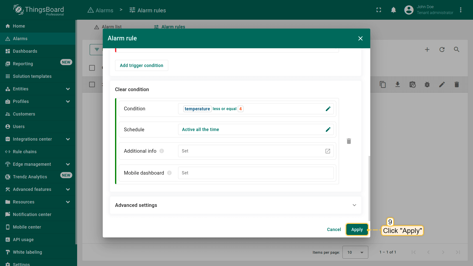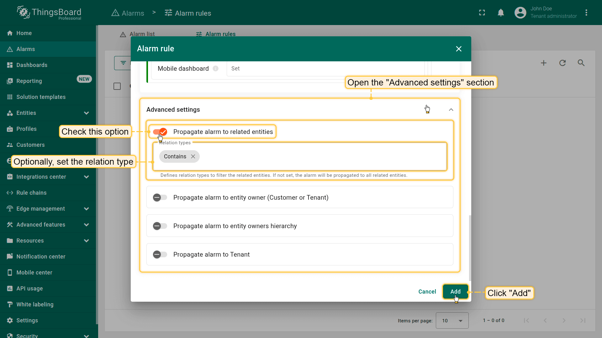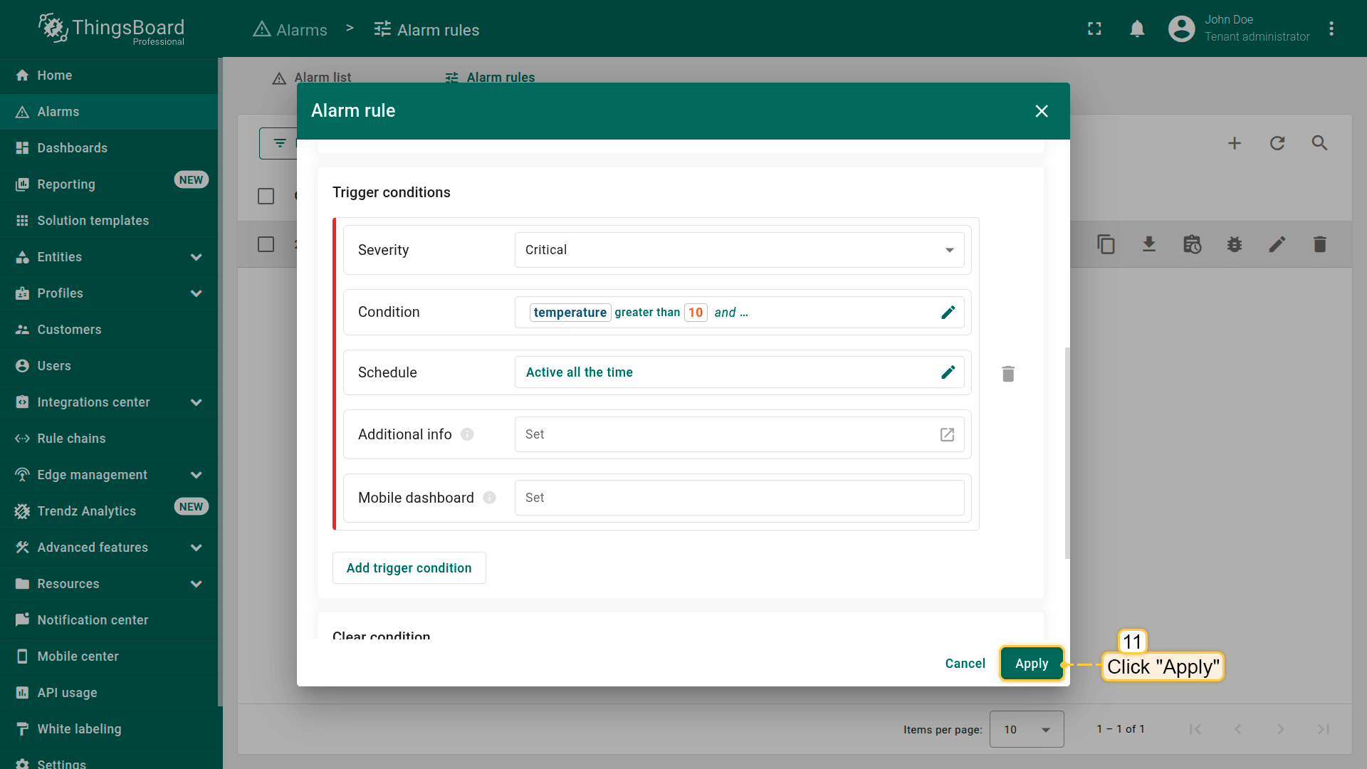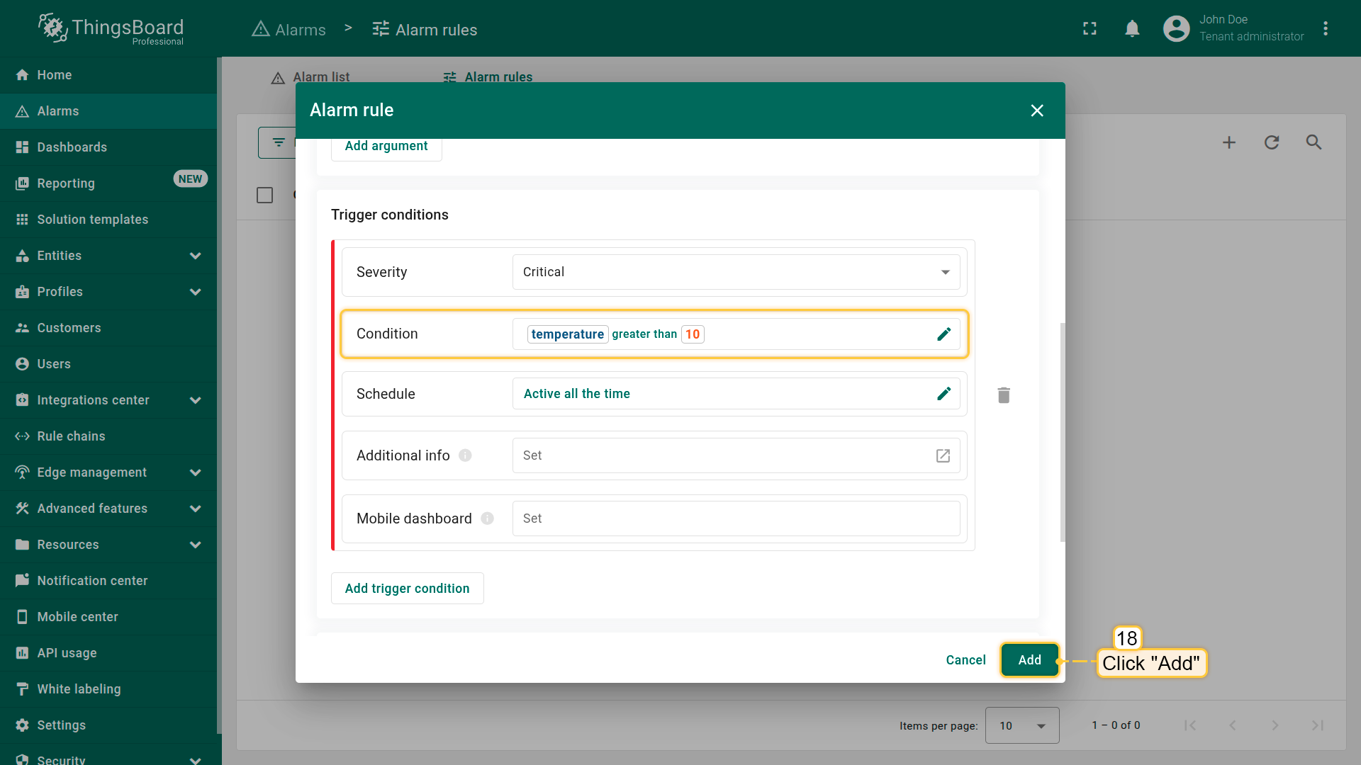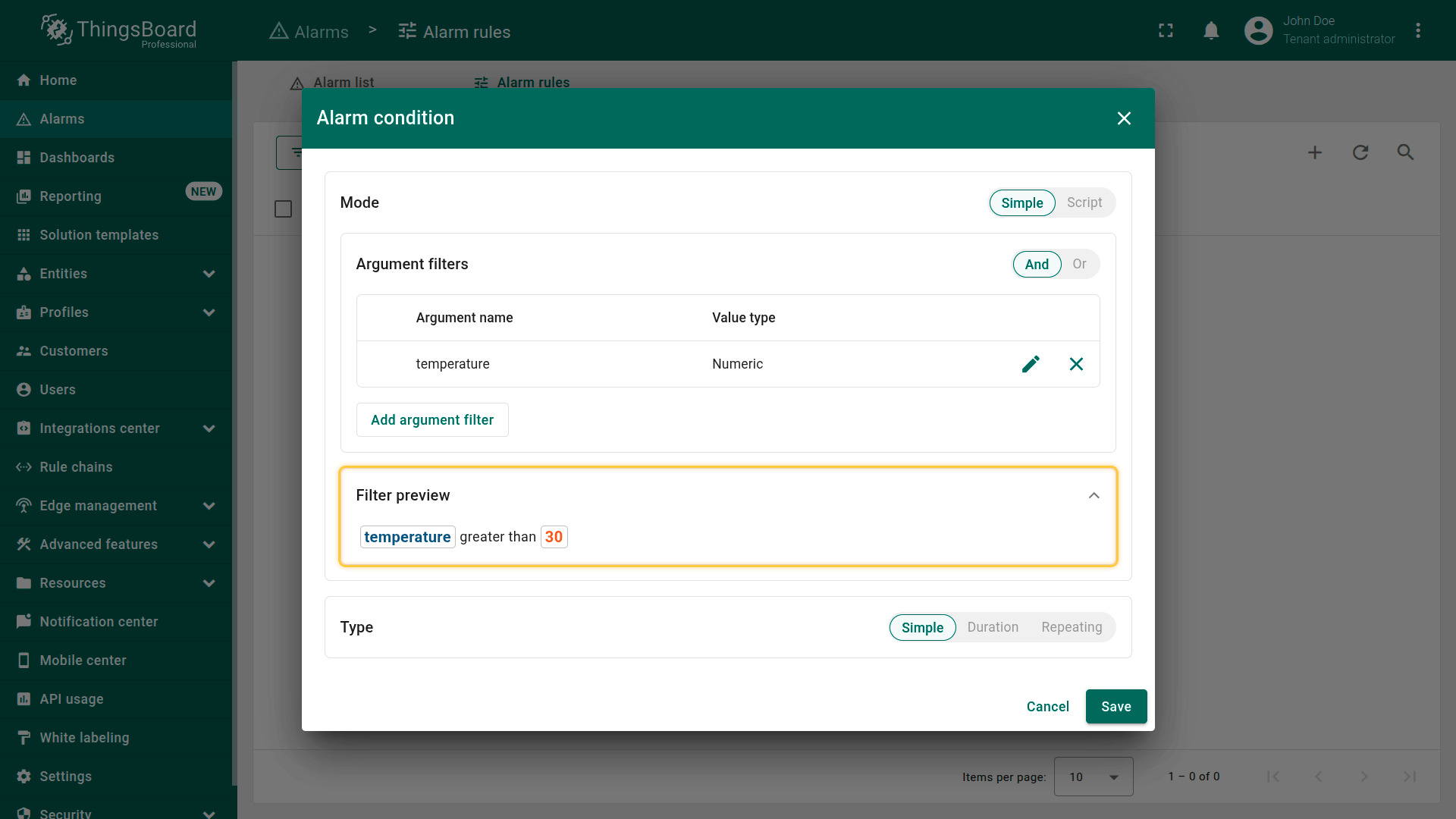 Note: The process of creating an alarm rule is the same for Devices, Assets, Device profiles, Asset profiles, or Customers.