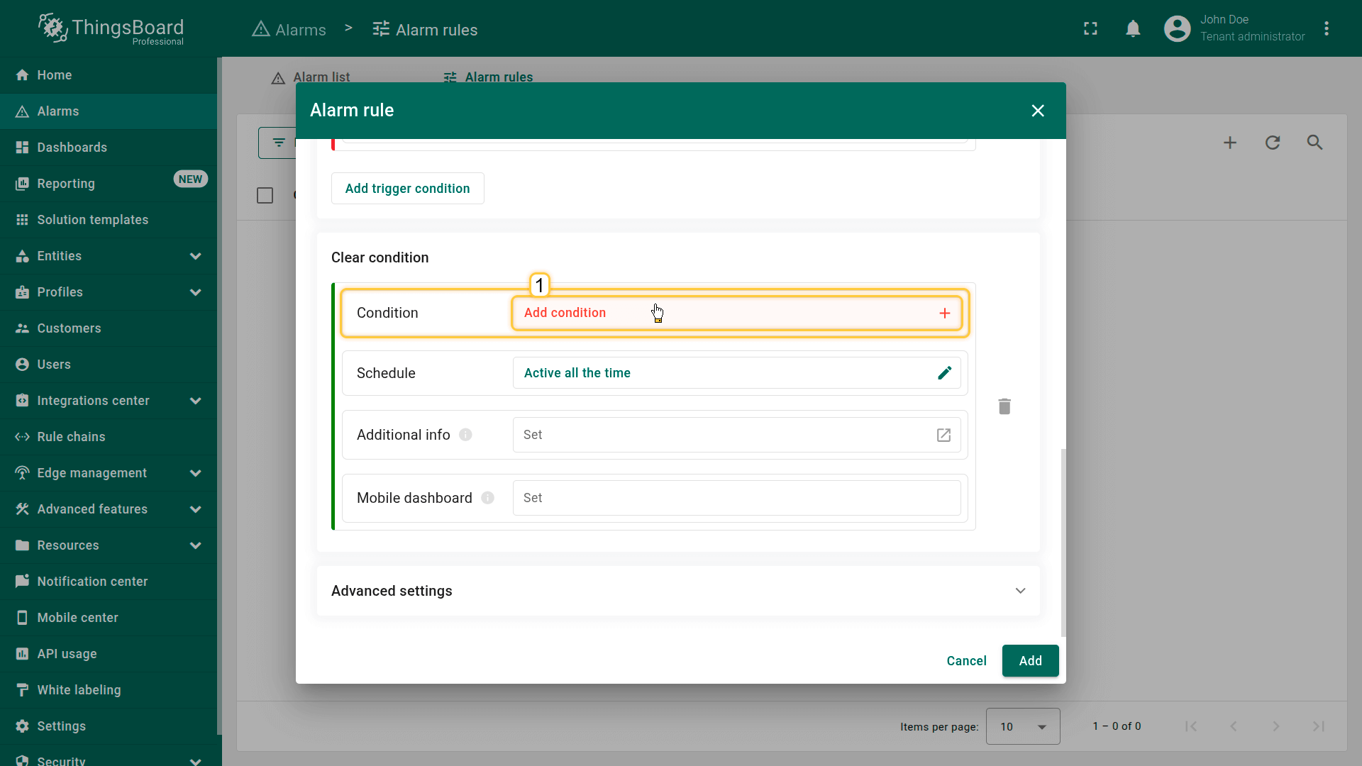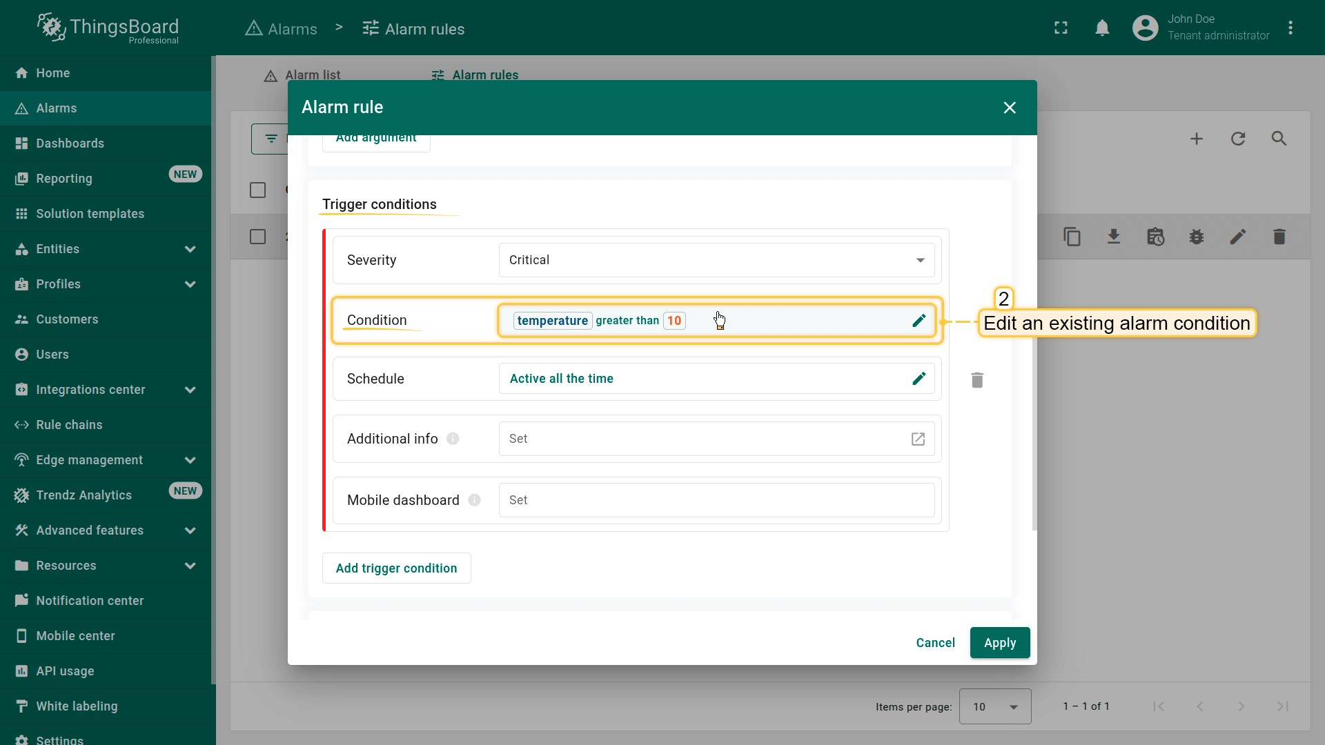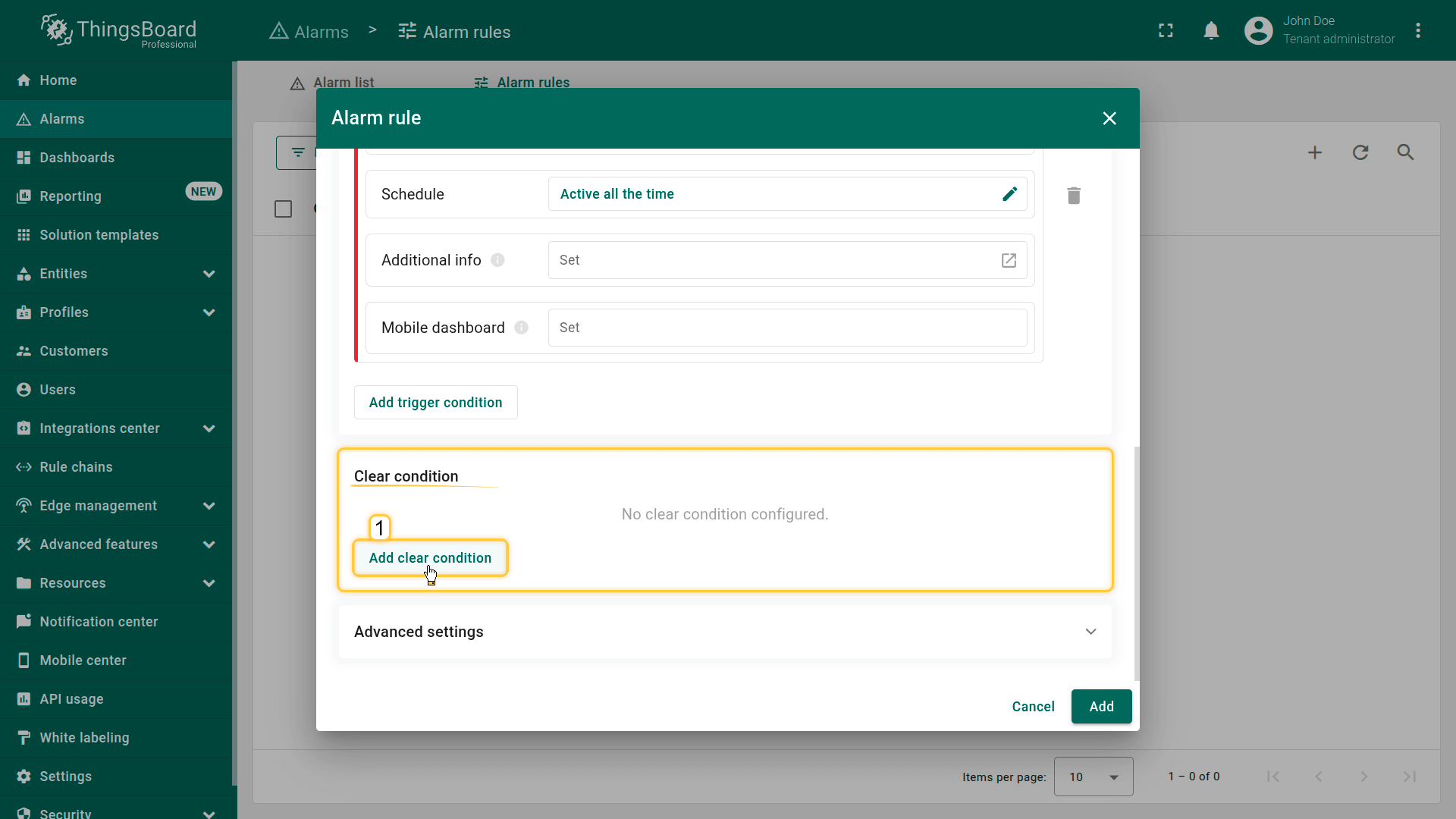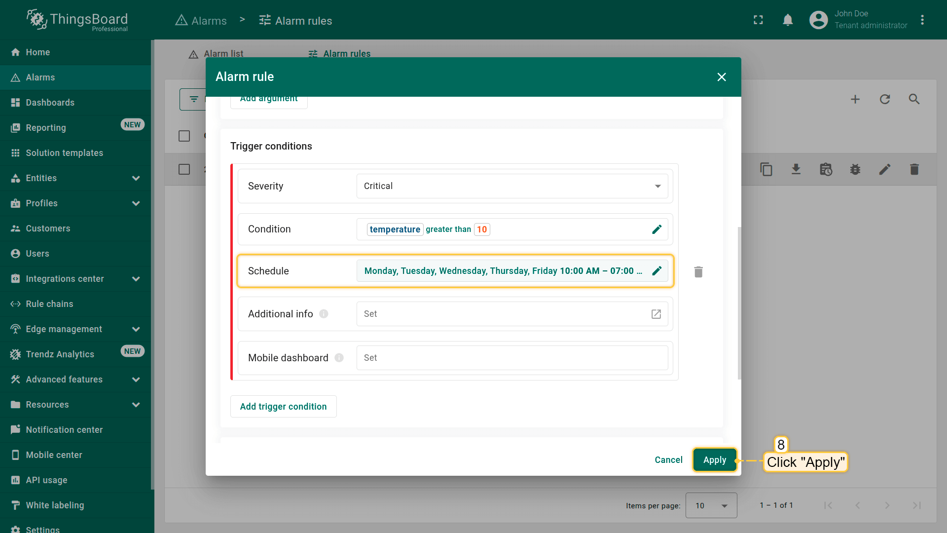 Note: The process of creating an alarm rule is the same for Devices, Assets, Device profiles, Asset profiles, or Customers.