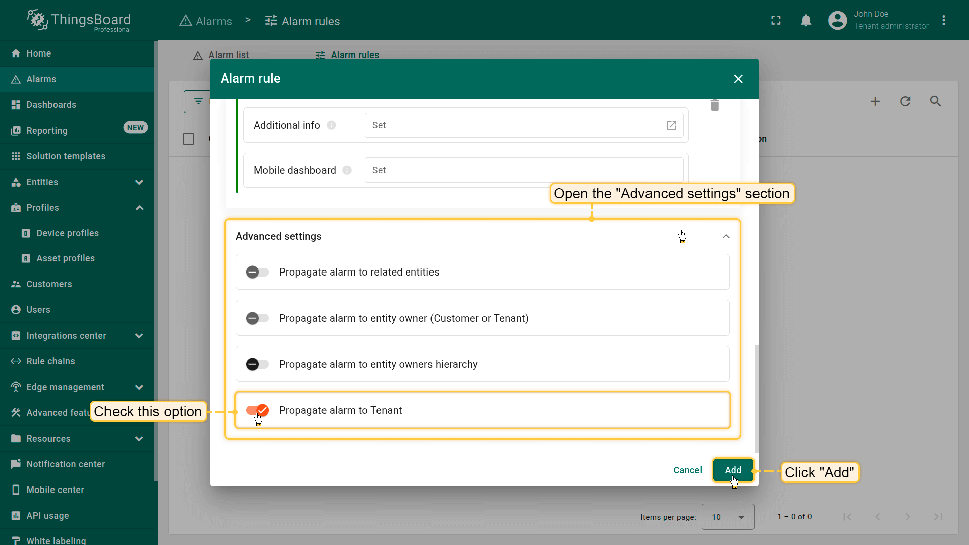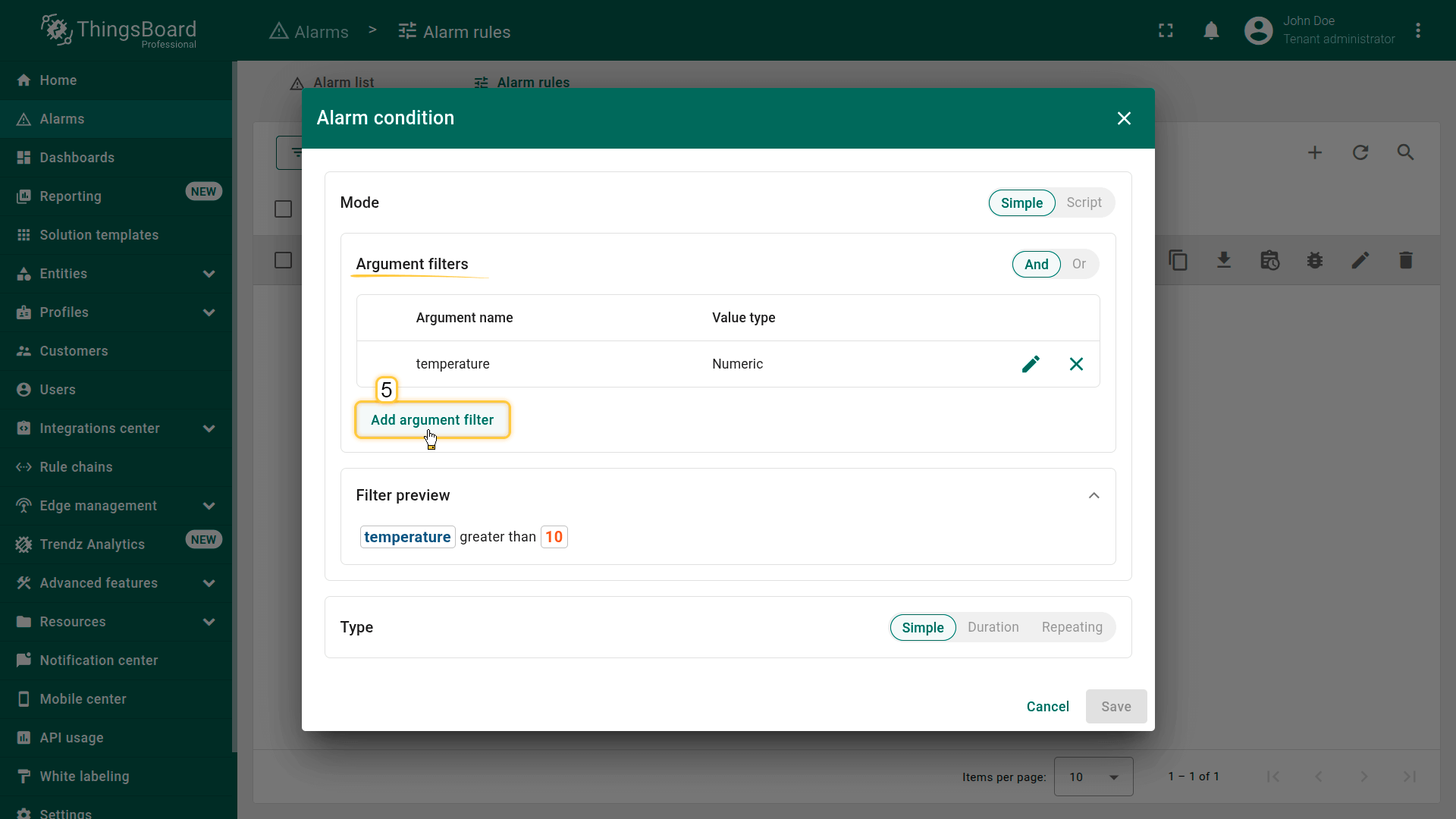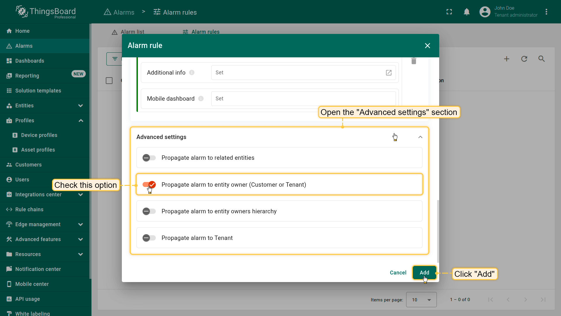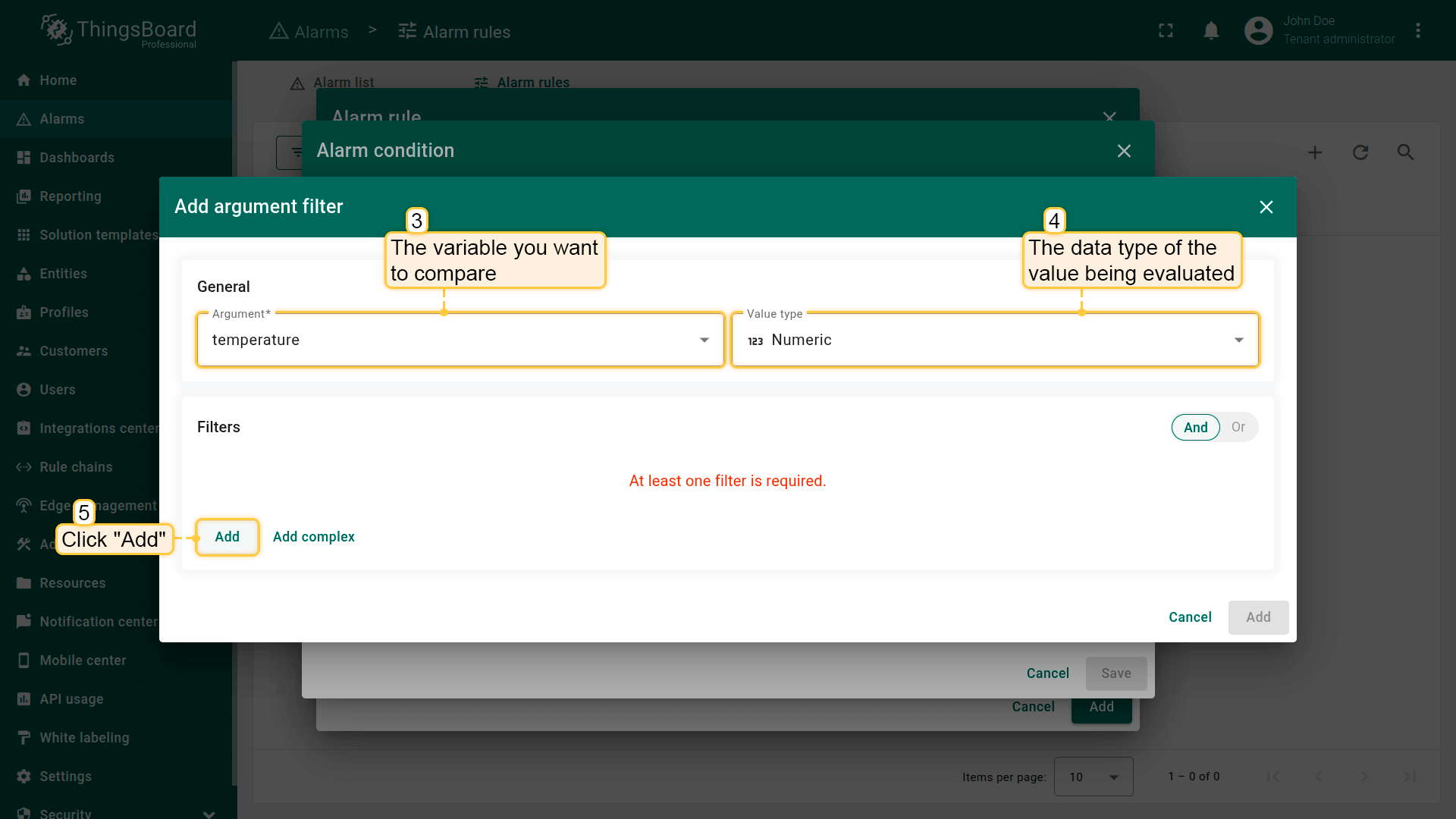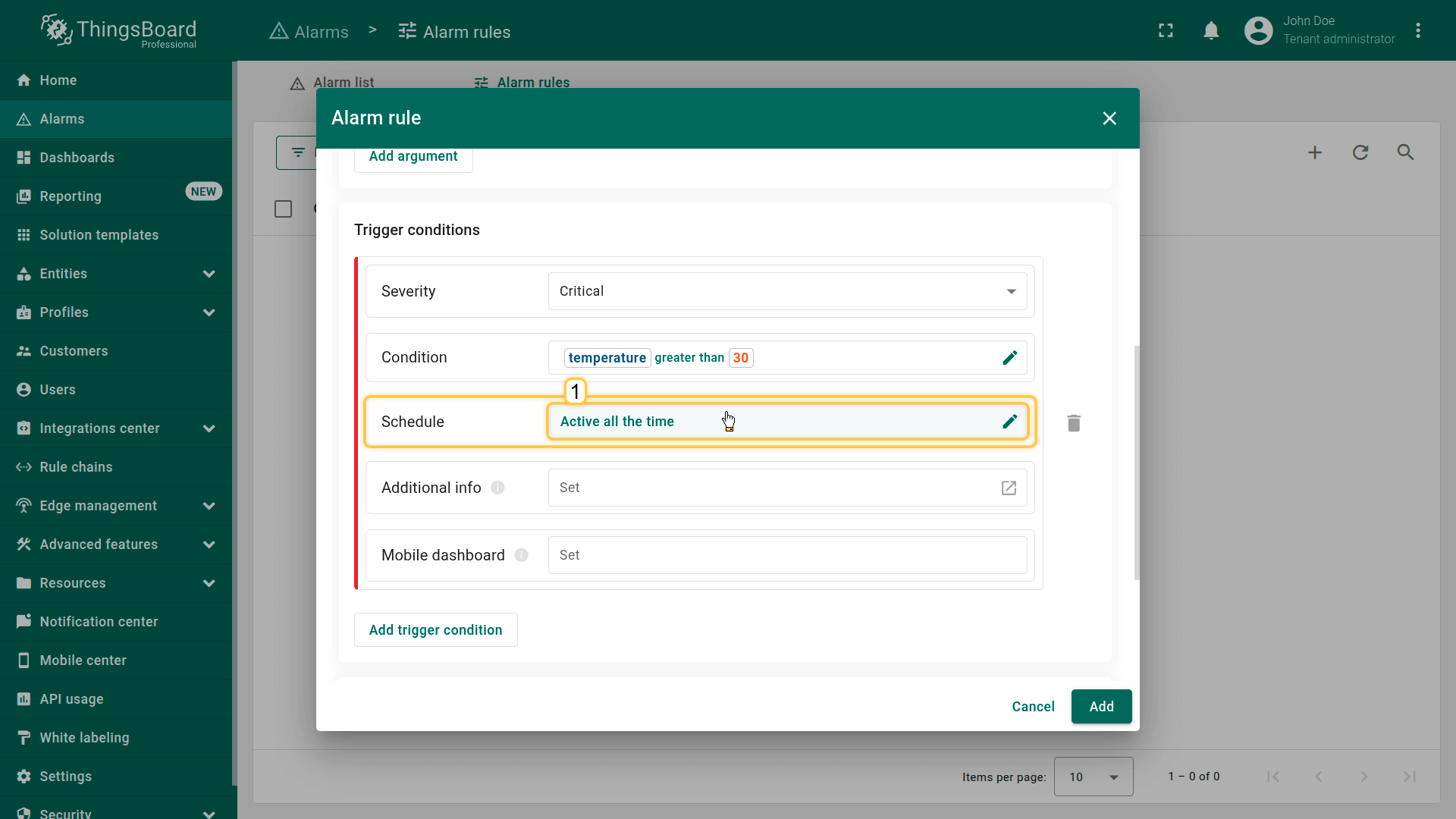 Note: The process of creating an alarm rule is the same for Devices, Assets, Device profiles, Asset profiles, or Customers.