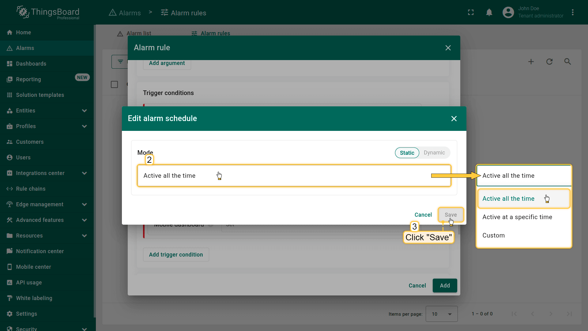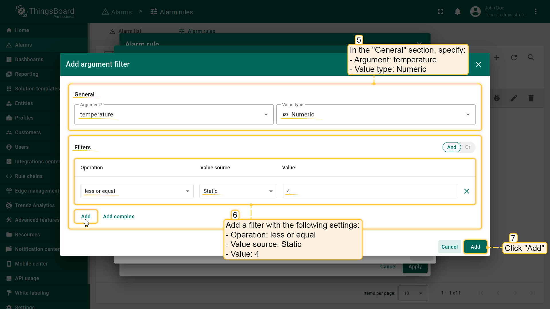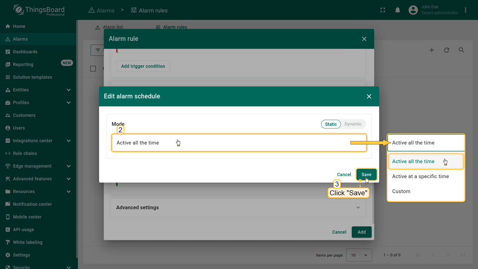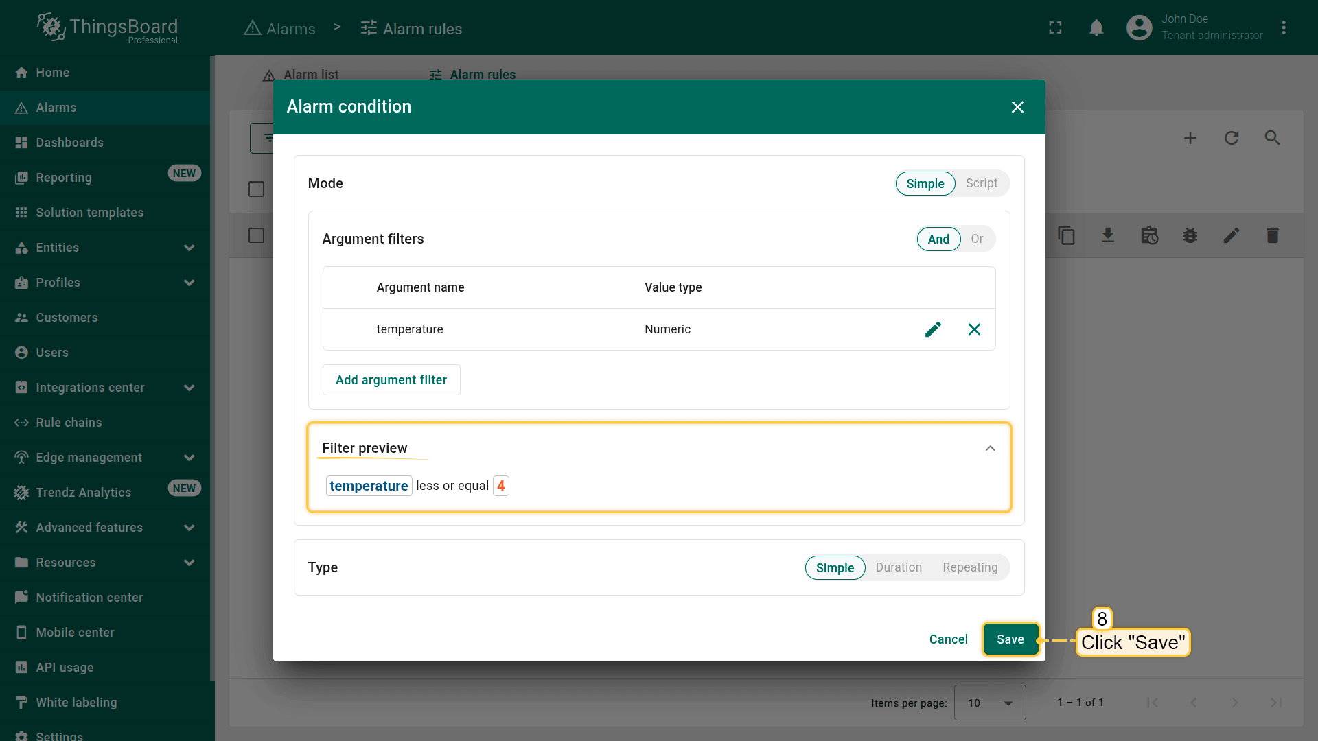 Note: The process of creating an alarm rule is the same for Devices, Assets, Device profiles, Asset profiles, or Customers.