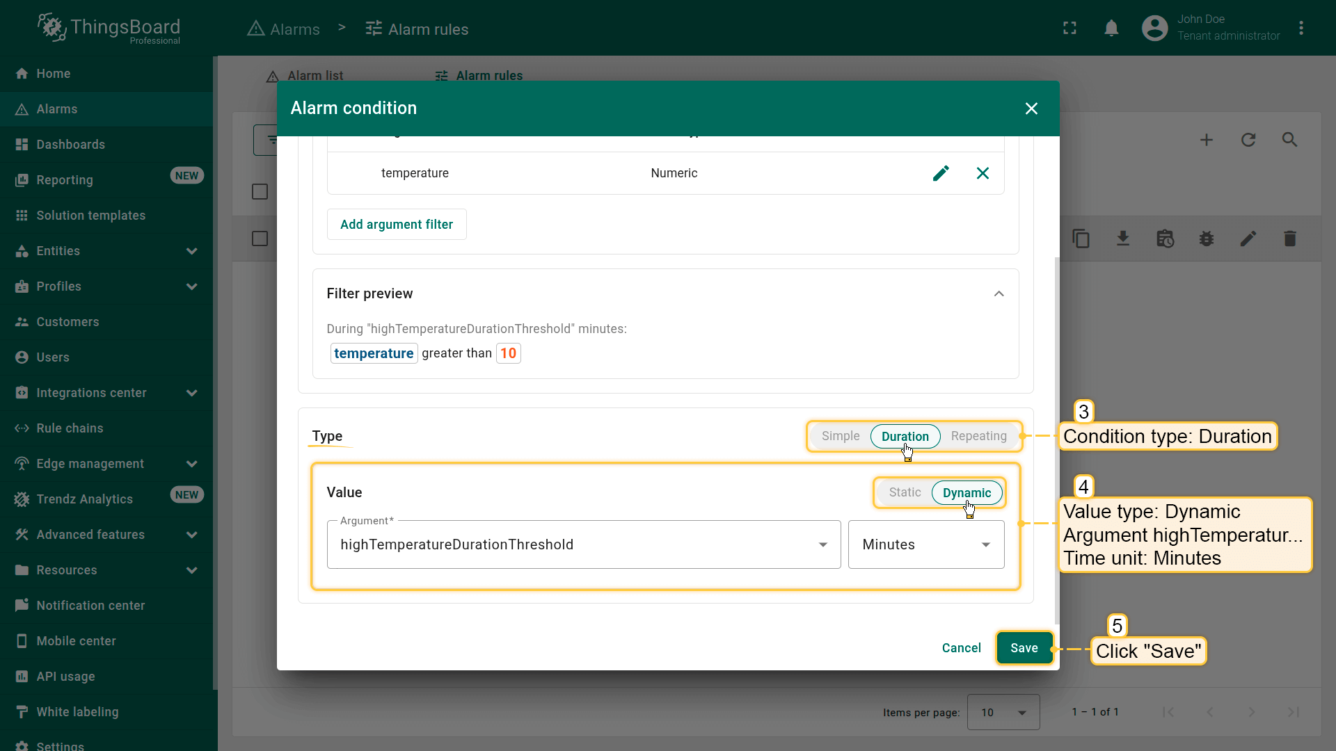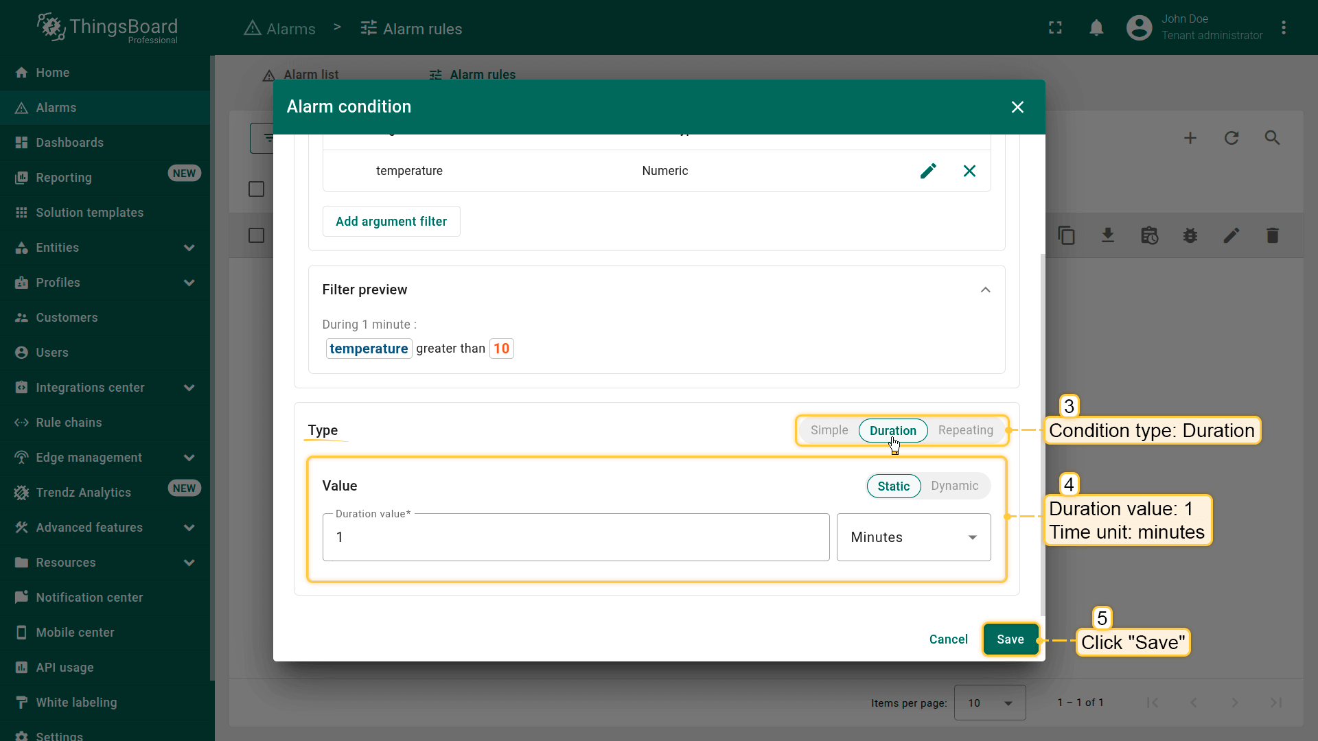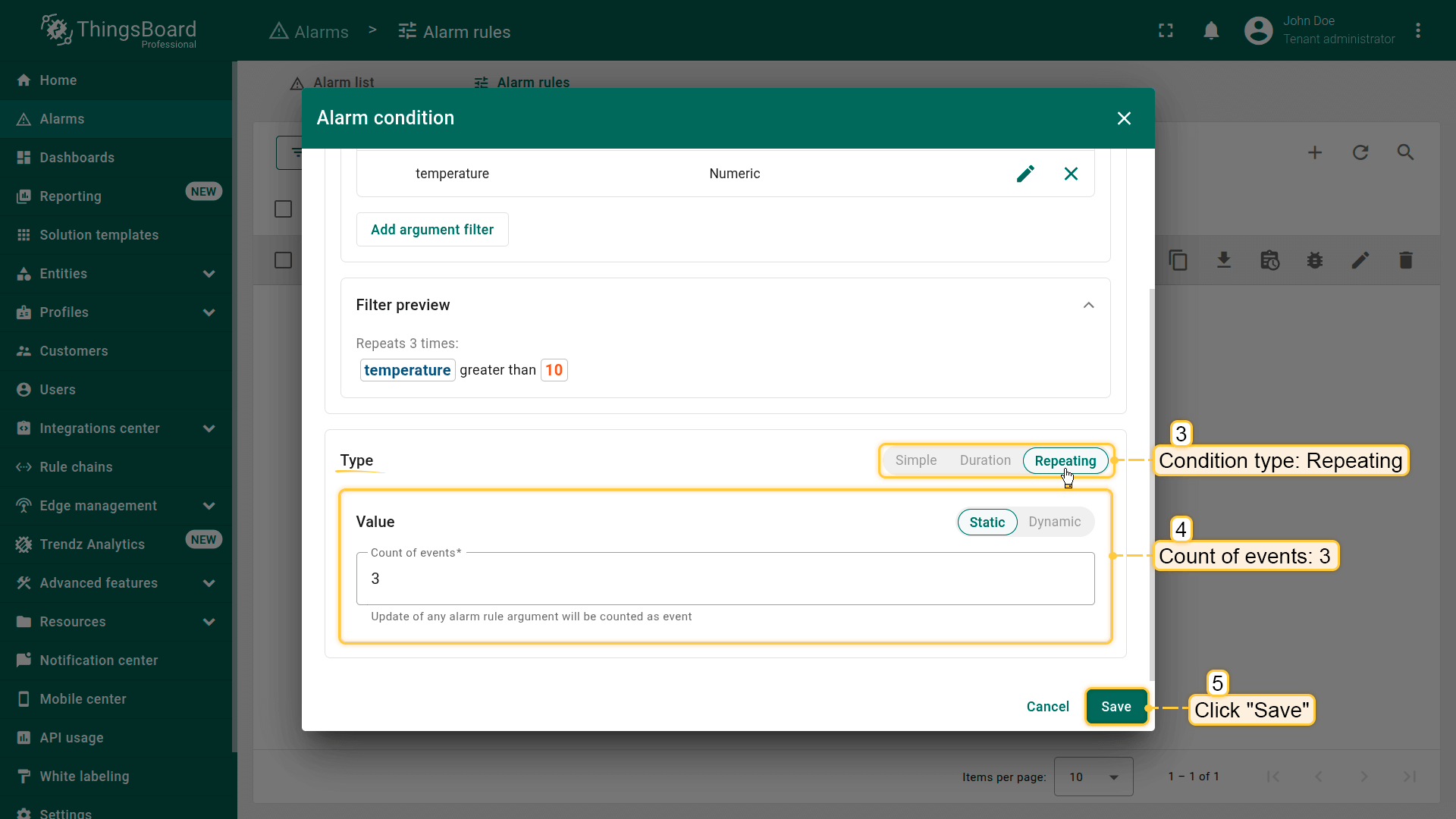 With this configuration, ThingsBoard will check whether the threshold condition occurs three times in a row before creating the alarm.