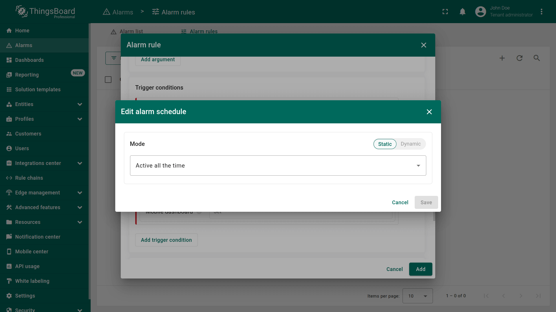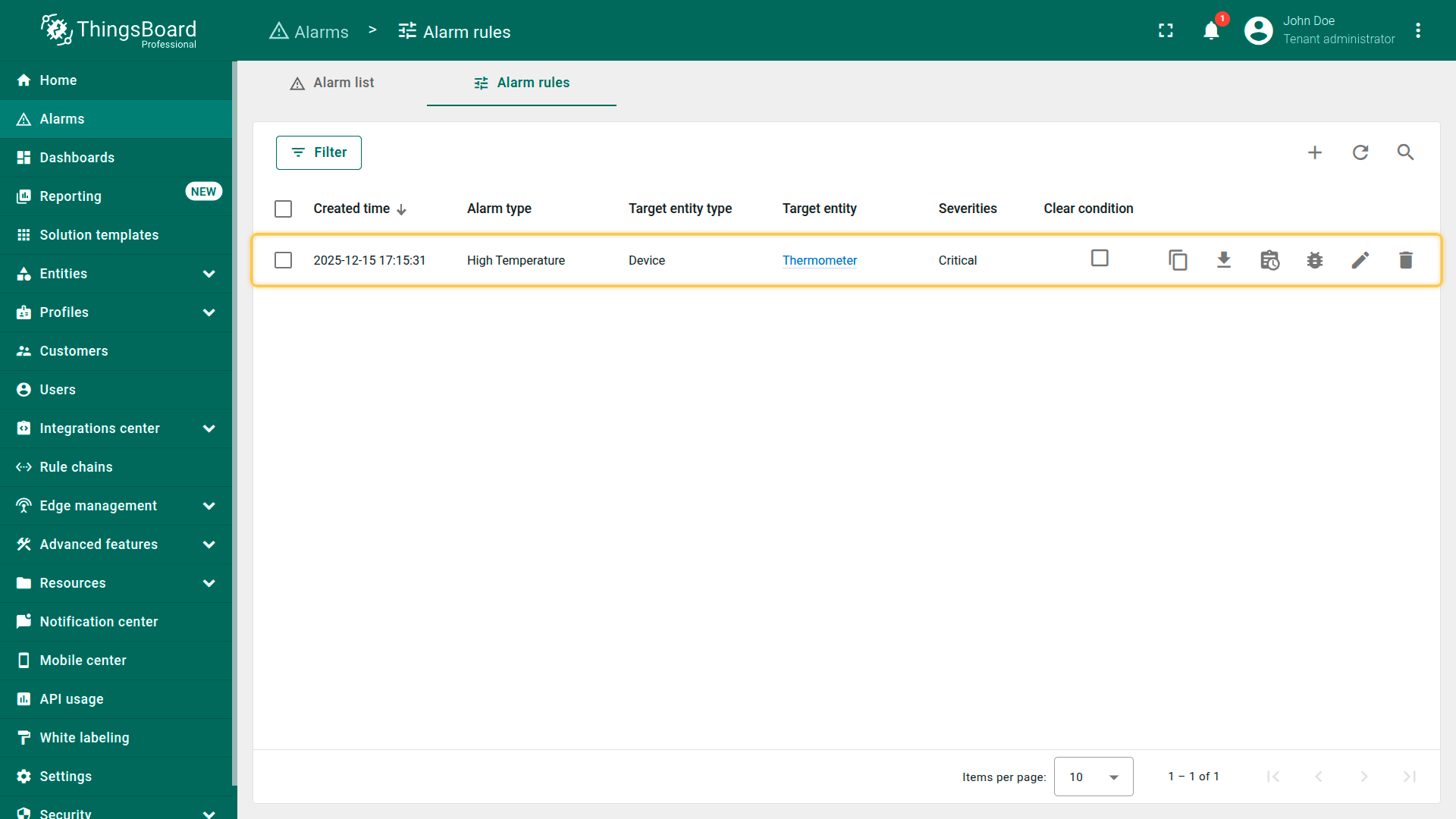 This page allows you to centrally manage all alarm rules in the system — both for individual entities and for profiles.