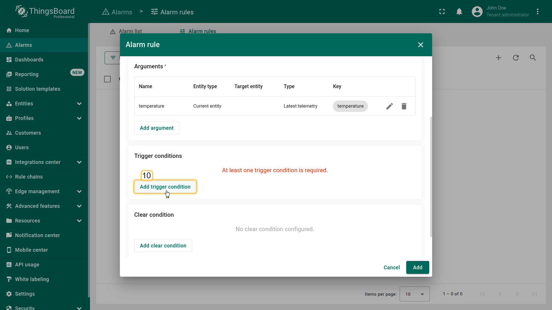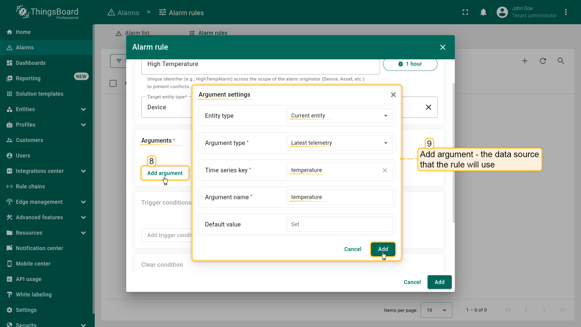 Before defining alarm conditions, you must add at least one argument — a data source that the rule will use during evaluation.