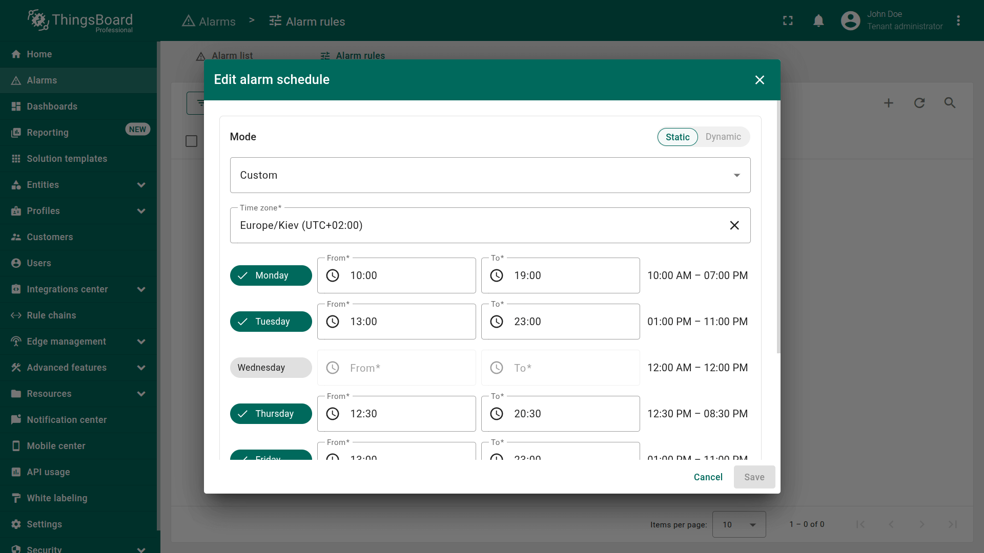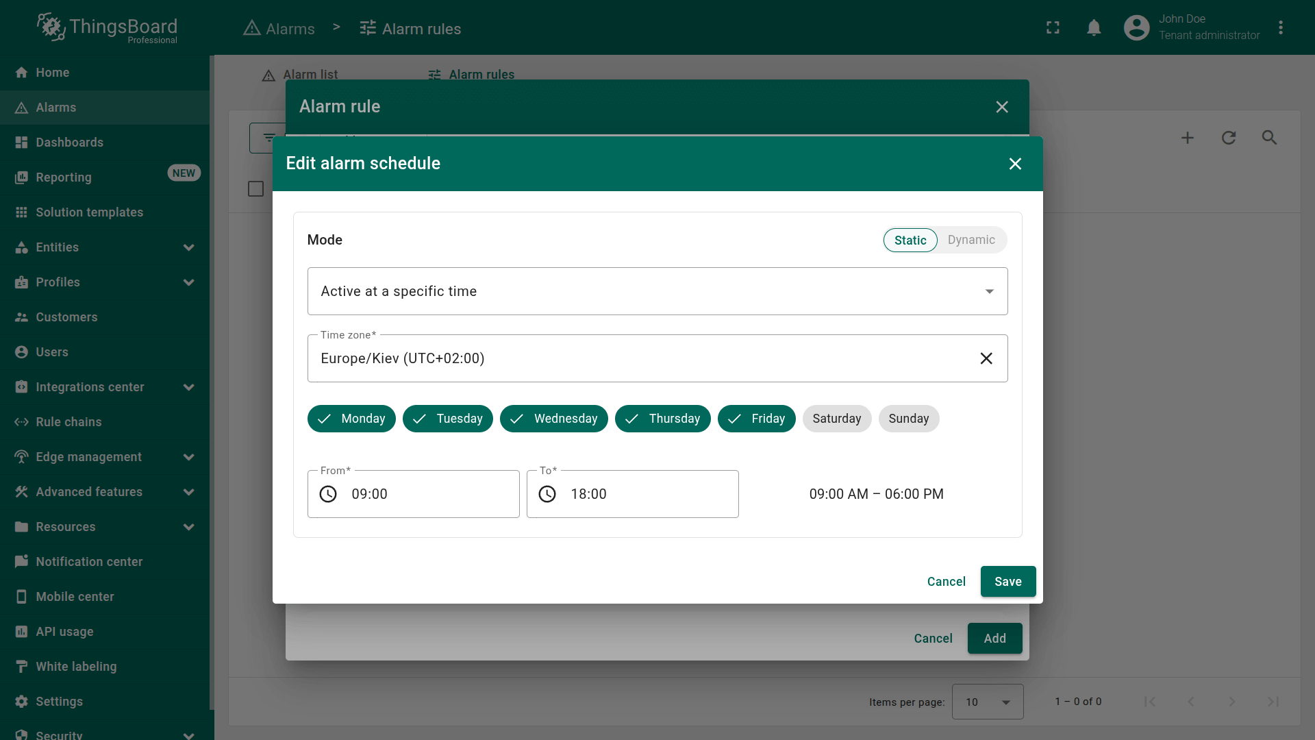 Starting from ThingsBoard 4.3, alarm rule configuration capabilities have been significantly enhanced. Rules can now be defined at the level of a Device, Asset, their Profiles, or even a Customer, enabling a multi-layered monitoring system that respects organizational structure and contextual logic. This approach allows precise control over when and where an alarm should be raised — globally, at the profile level, or for a specific device or entity.