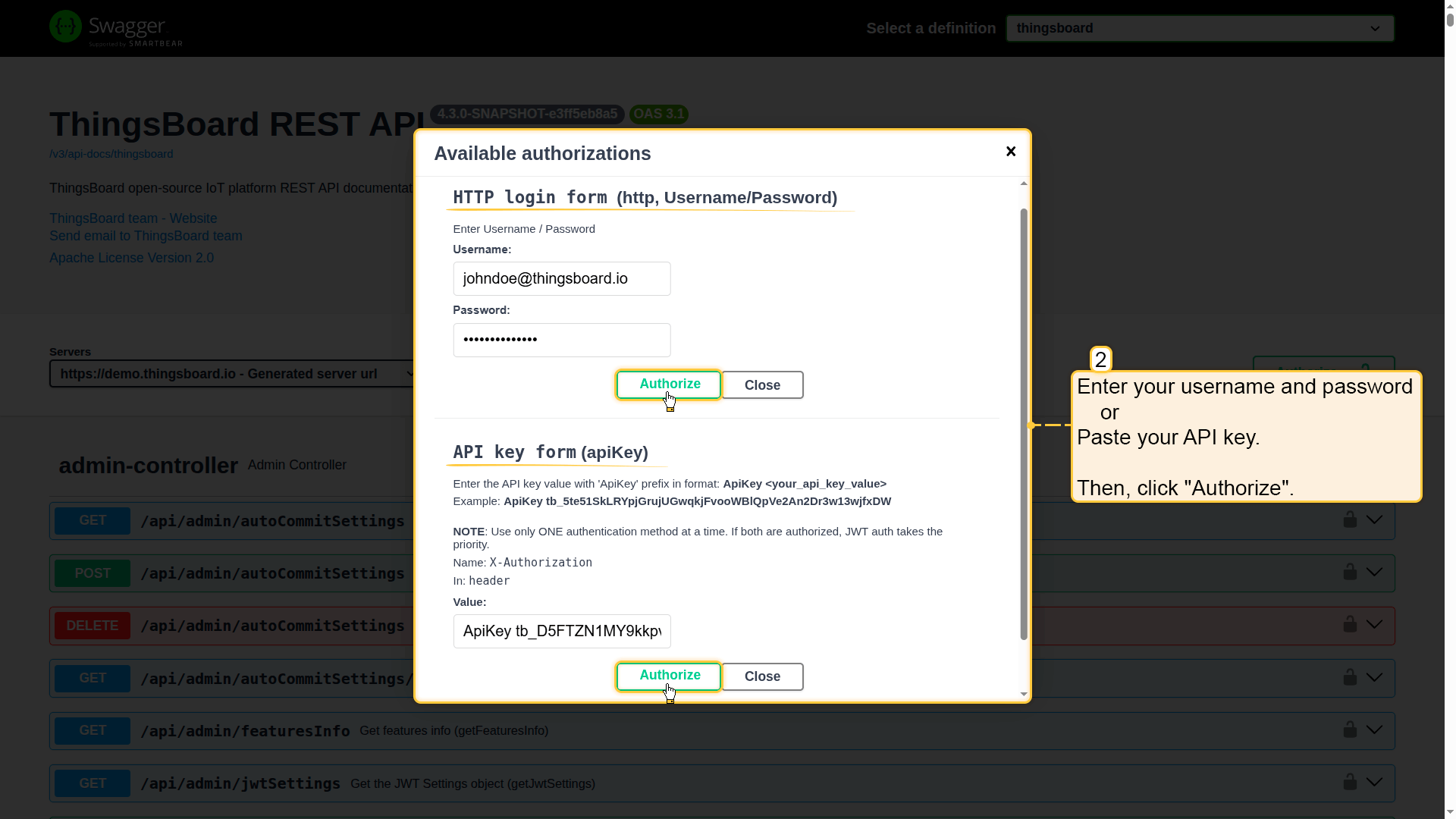 orpaste your API key In the API key form (apiKey) section. - Click Authorize