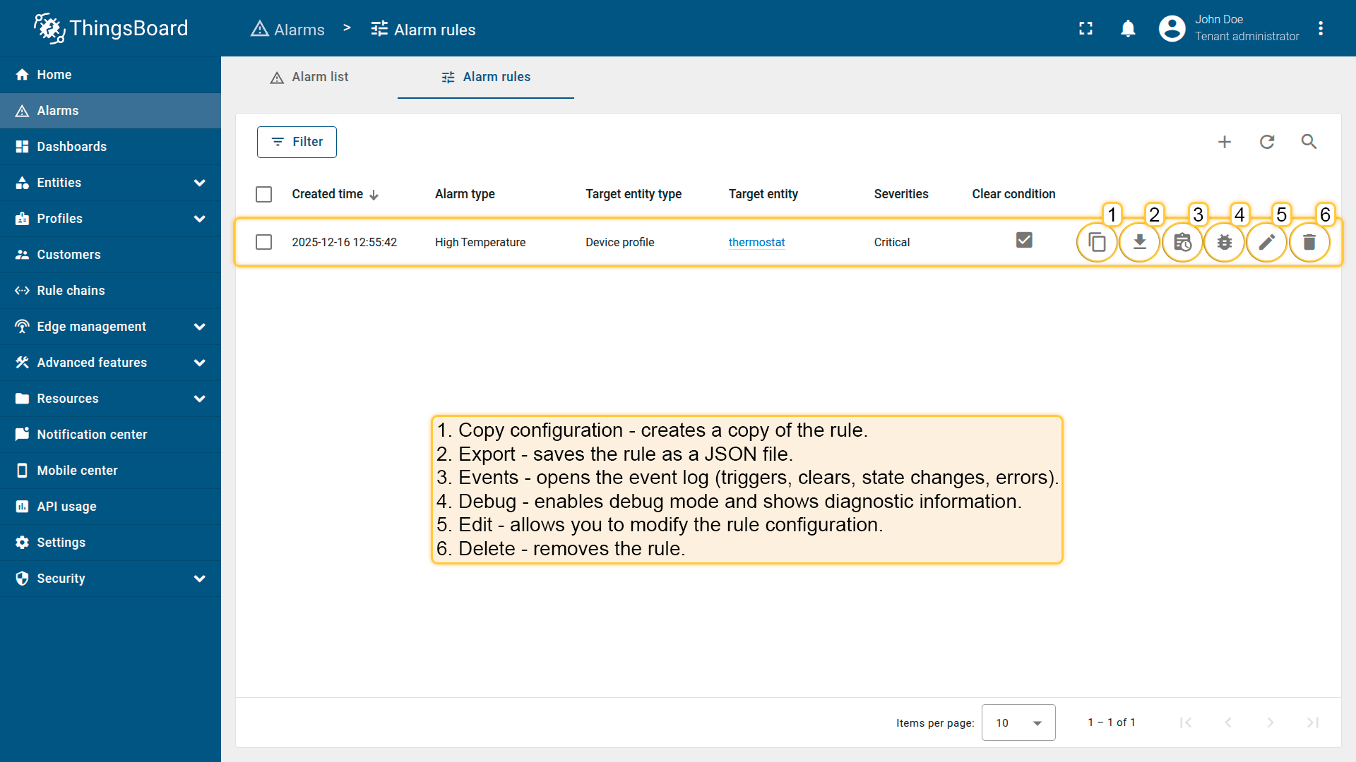 This page allows you to centrally manage all alarm rules in the system — both for individual entities and for profiles.