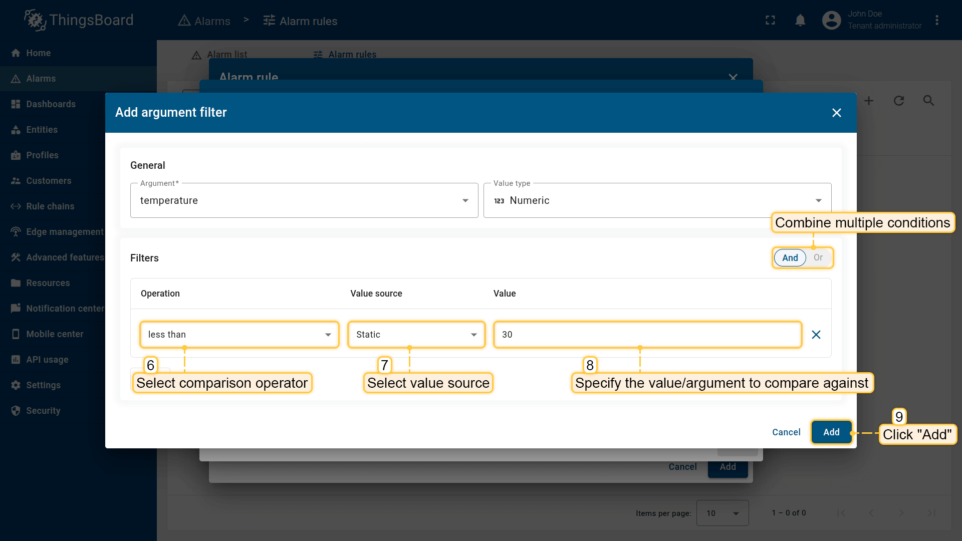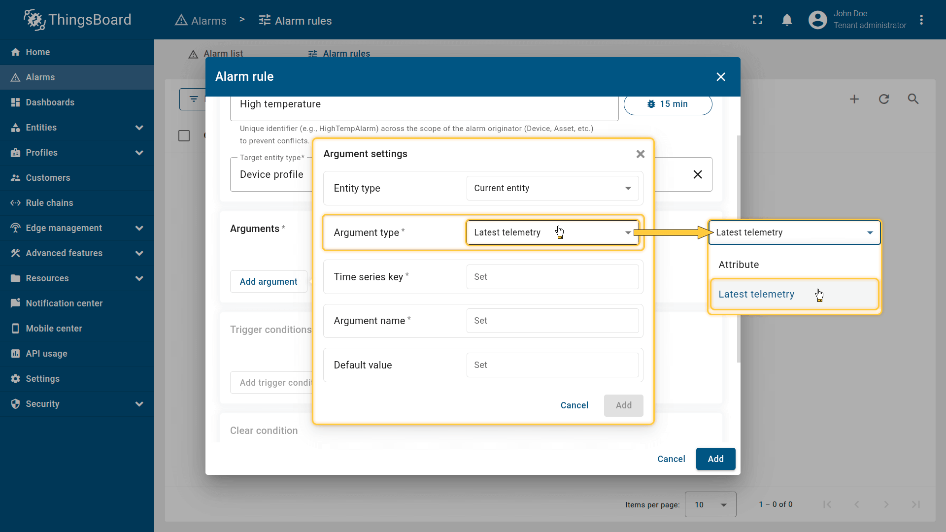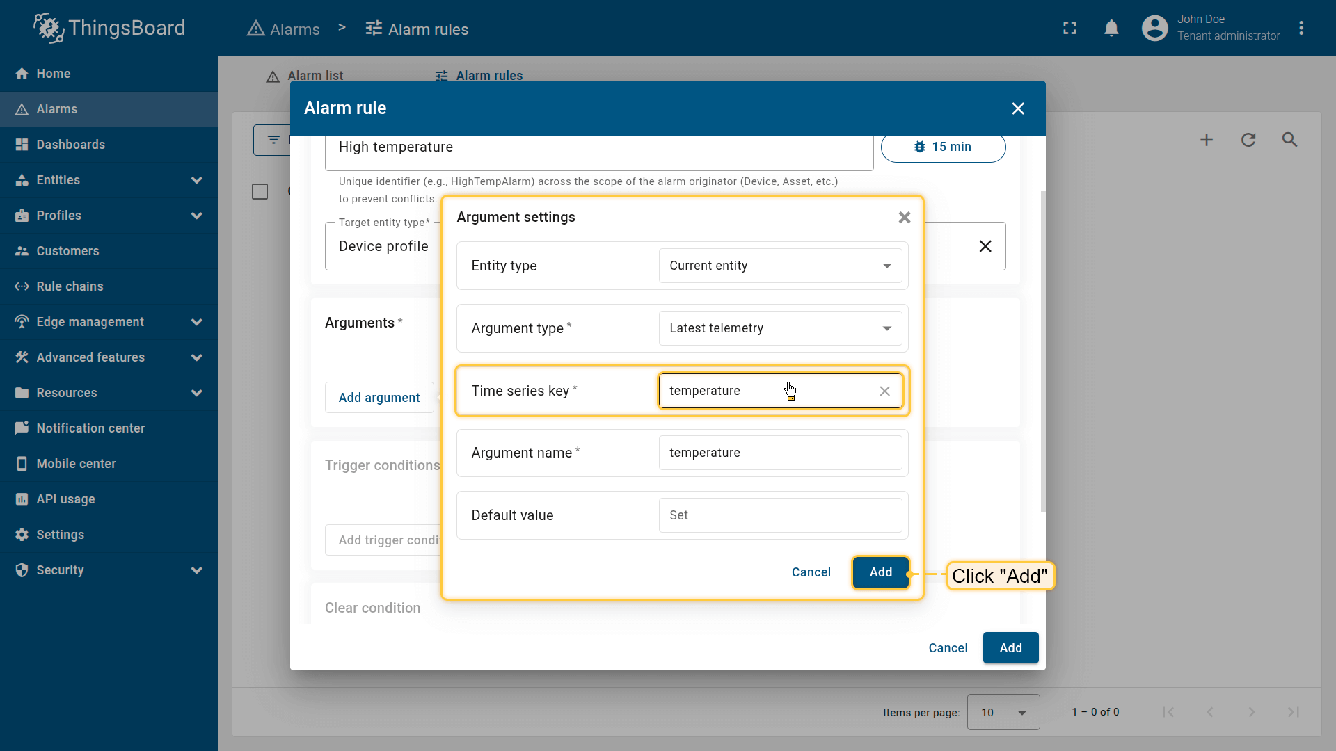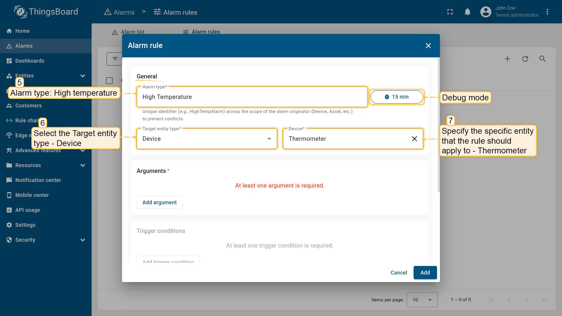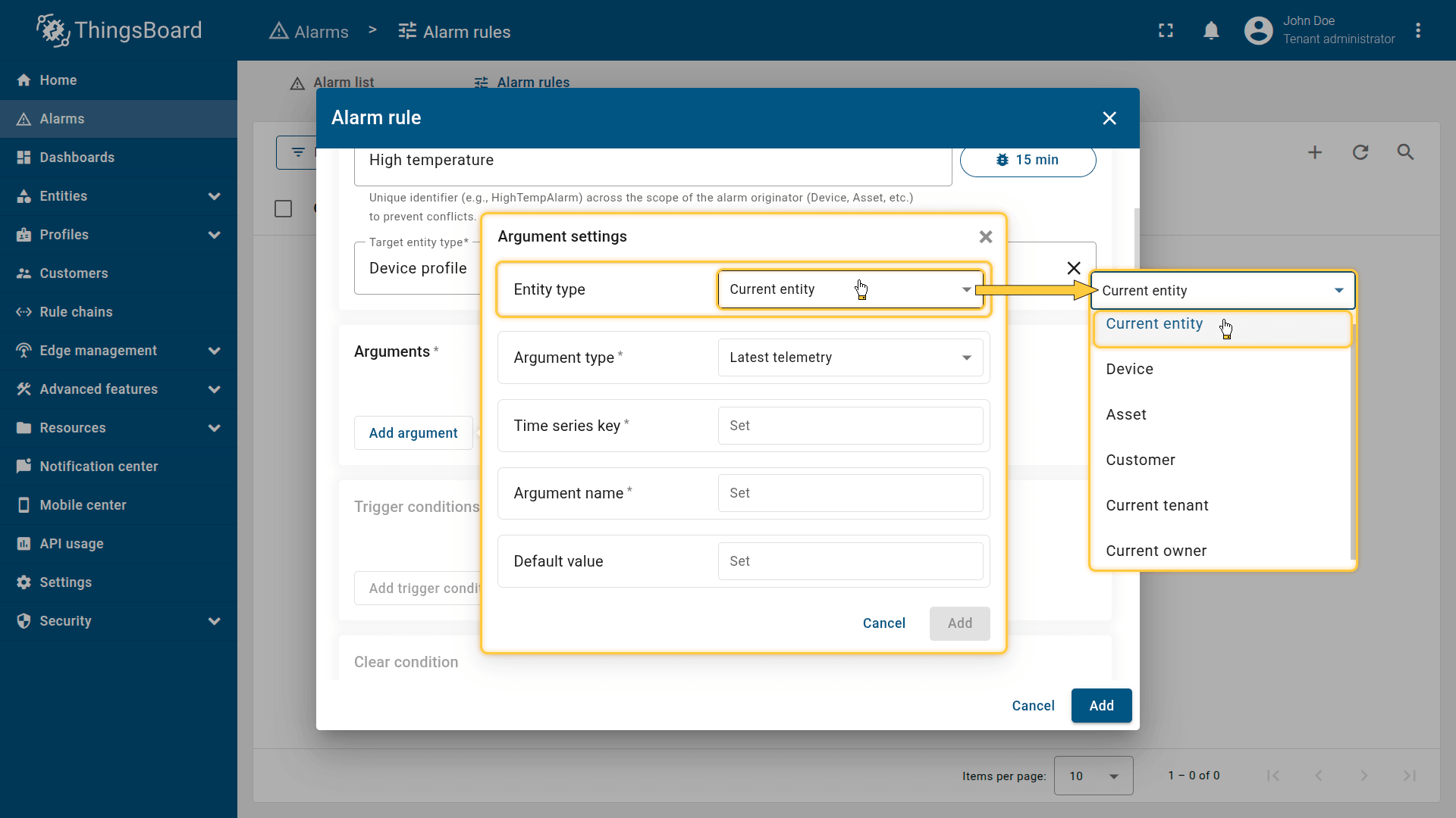 Note: The process of creating an alarm rule is the same for Devices, Assets, Device profiles, Asset profiles, or Customers.