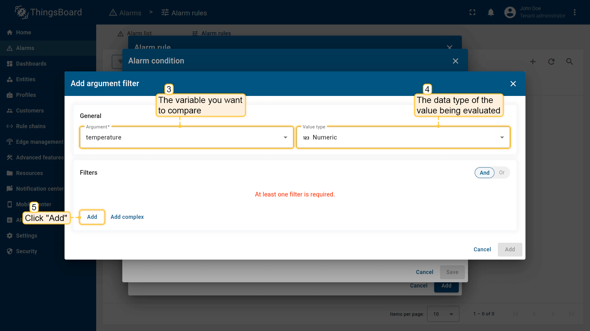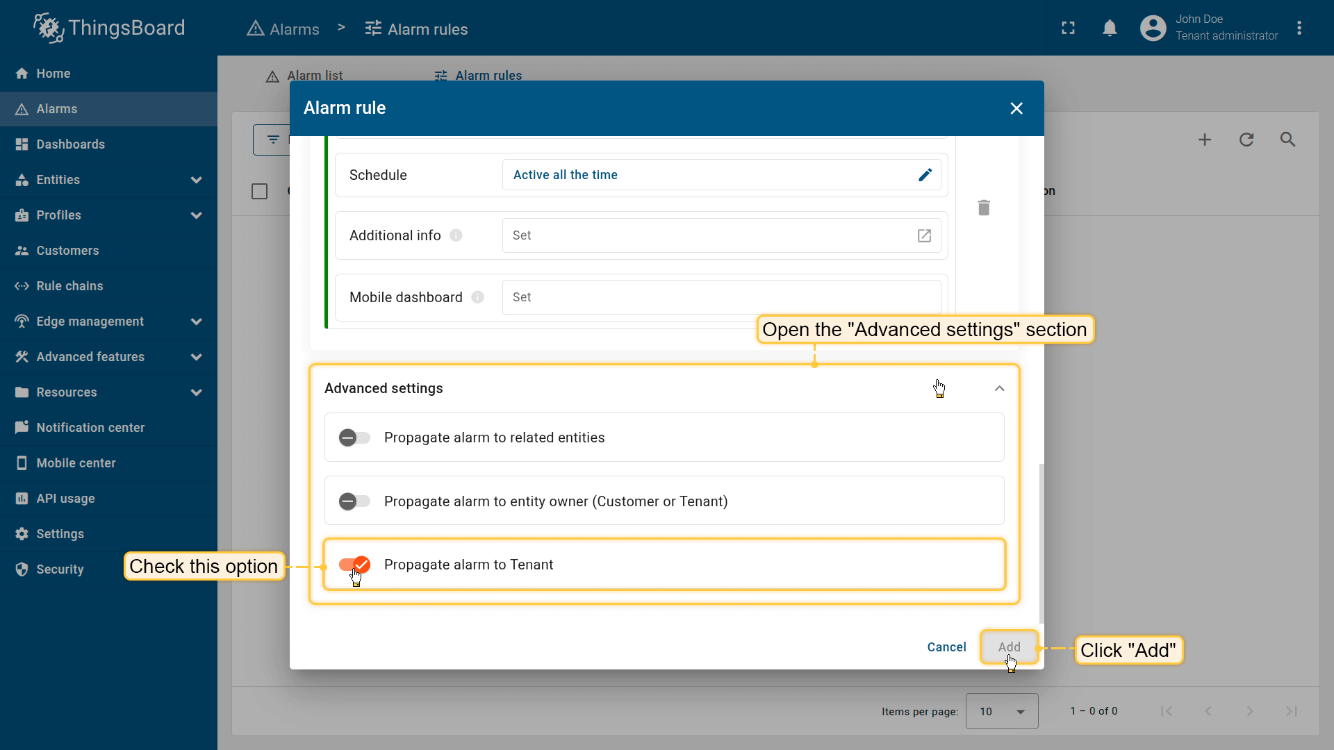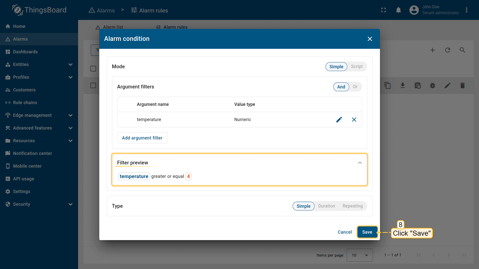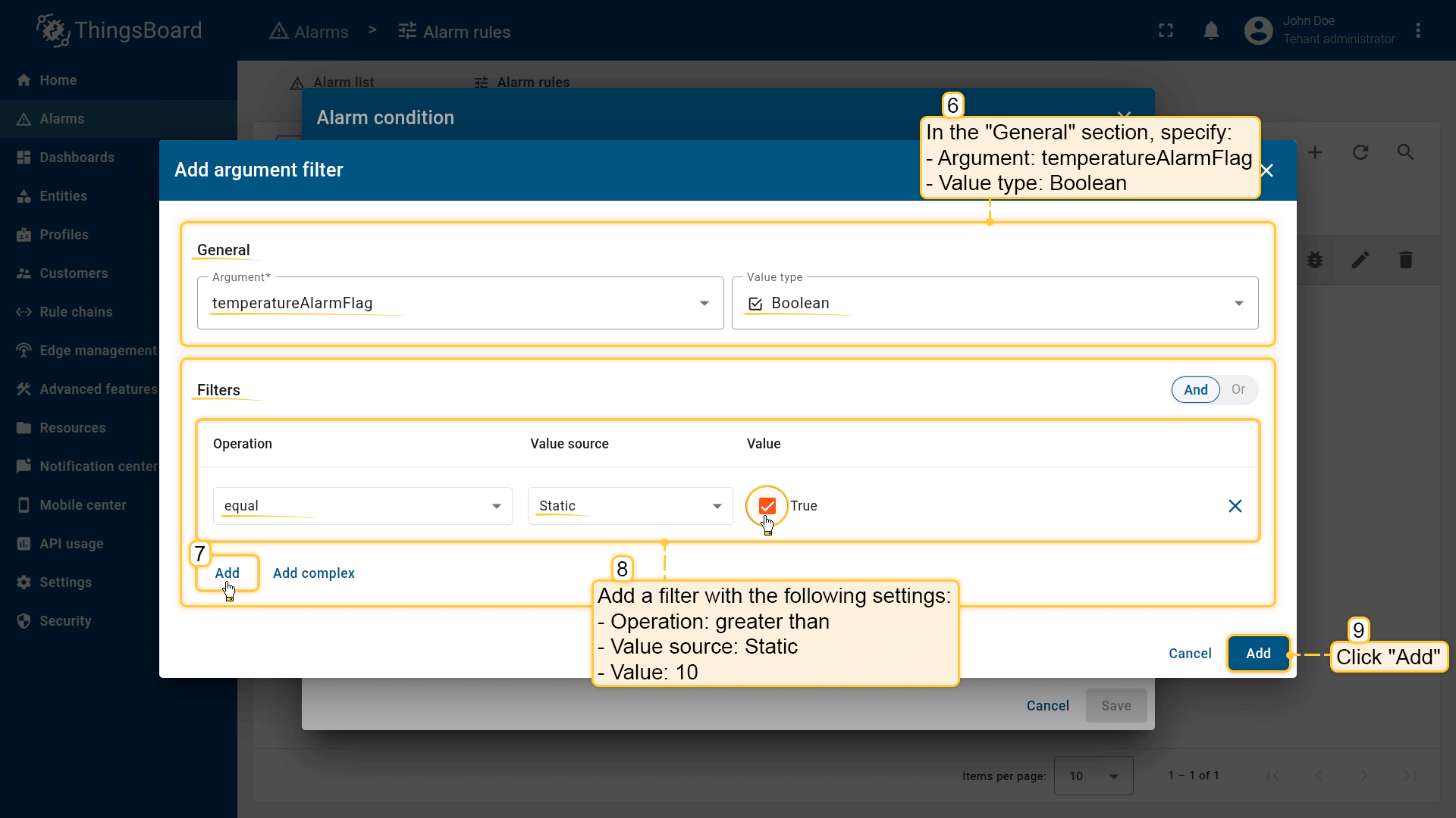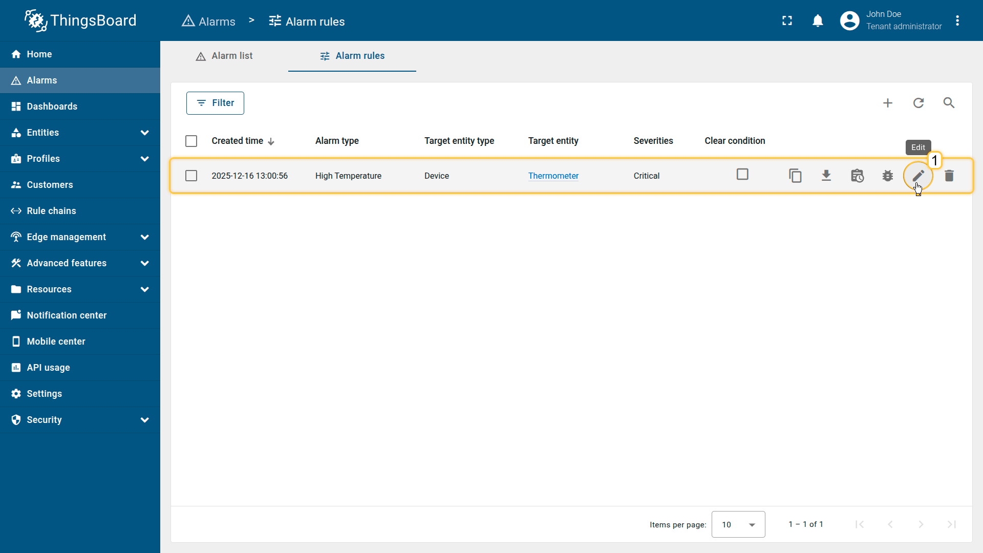 Note: The process of creating an alarm rule is the same for Devices, Assets, Device profiles, Asset profiles, or Customers.