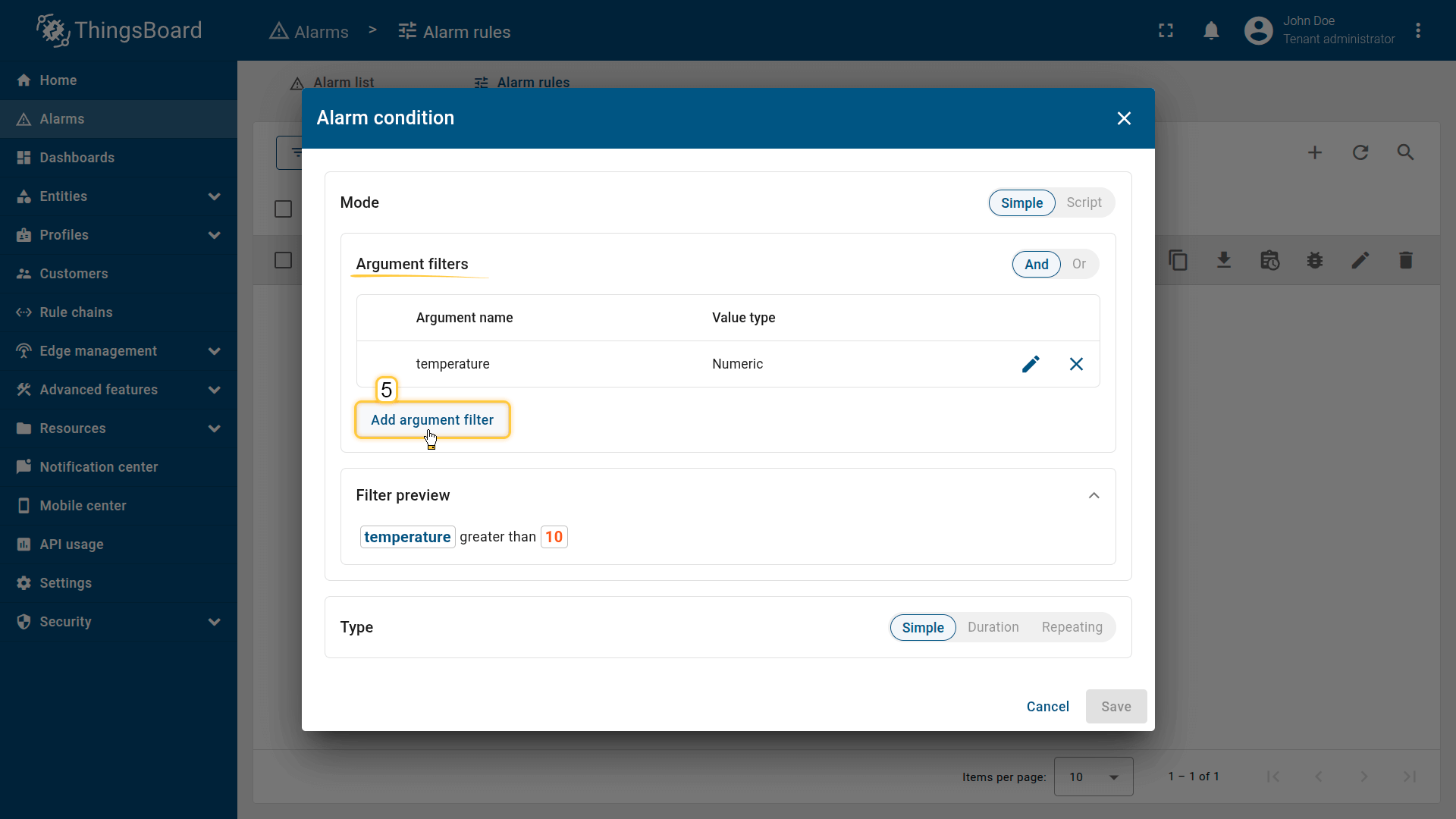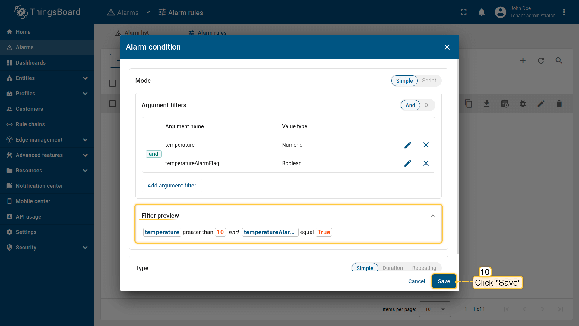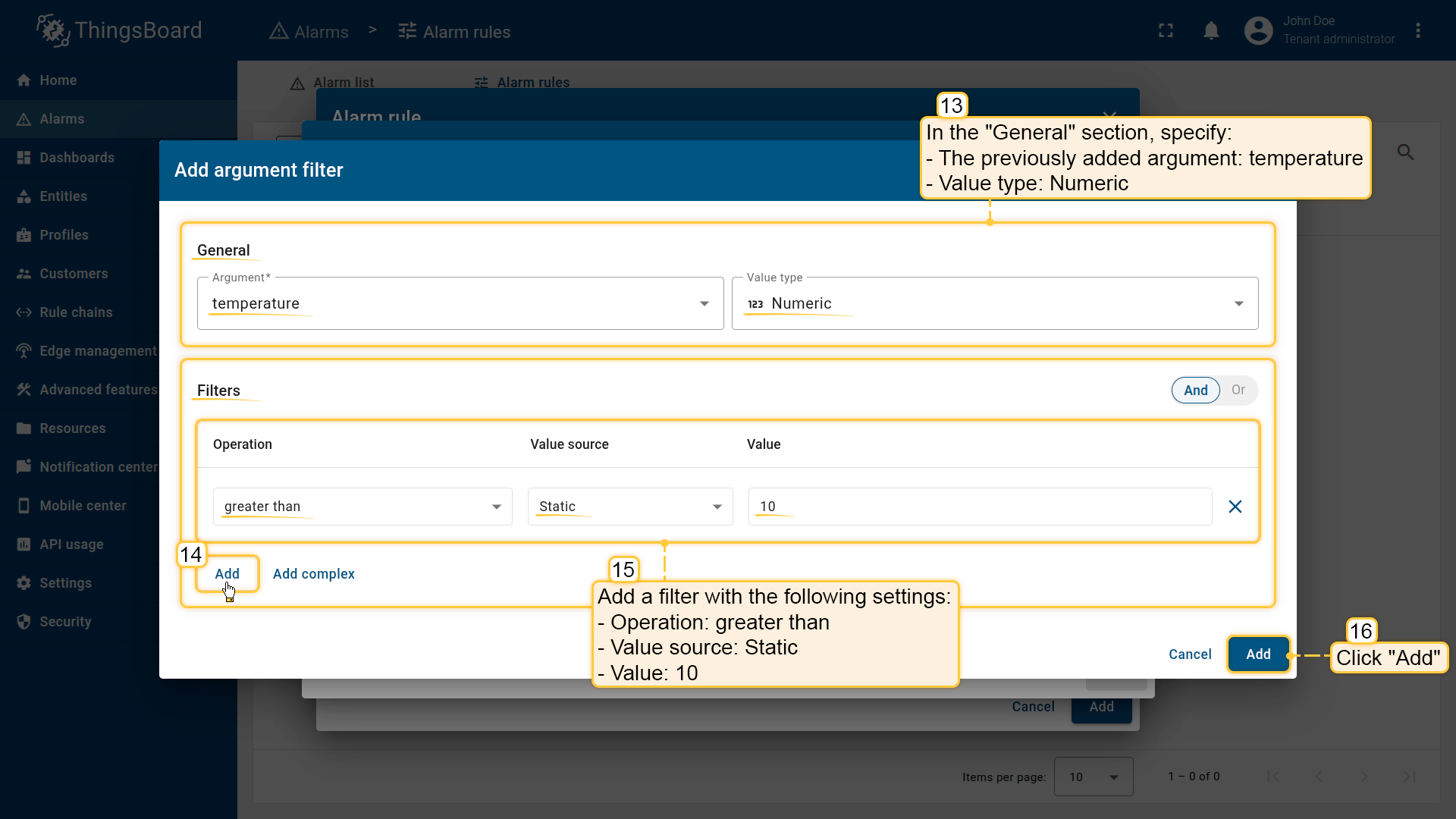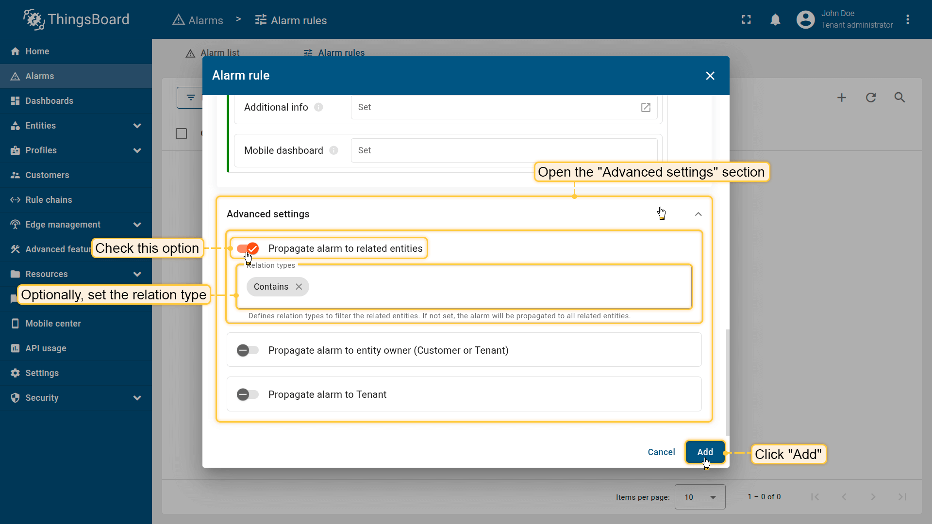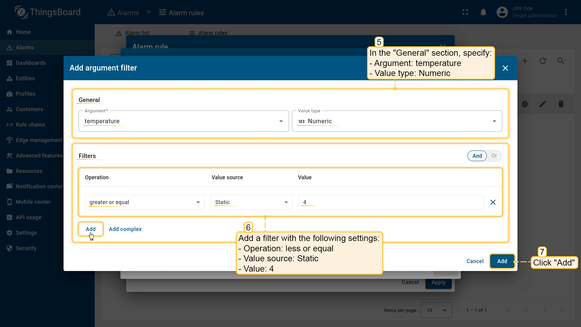 Note: The process of creating an alarm rule is the same for Devices, Assets, Device profiles, Asset profiles, or Customers.