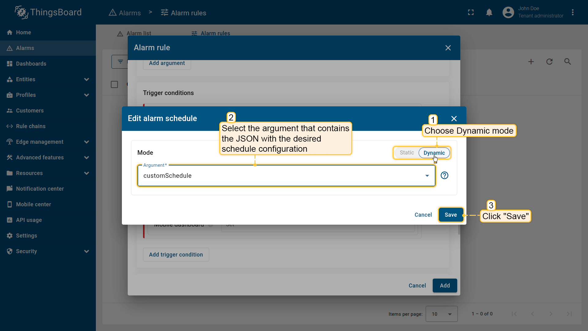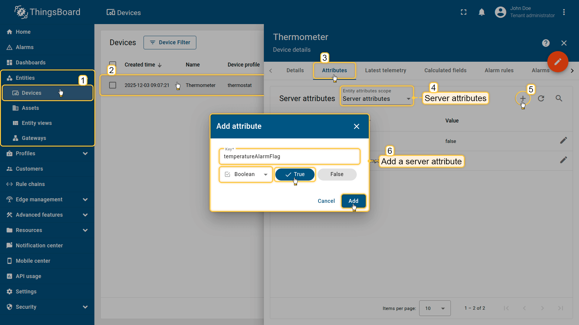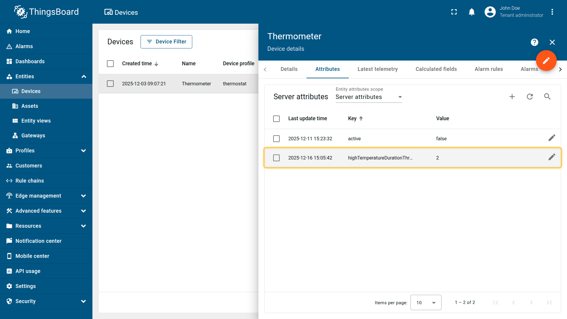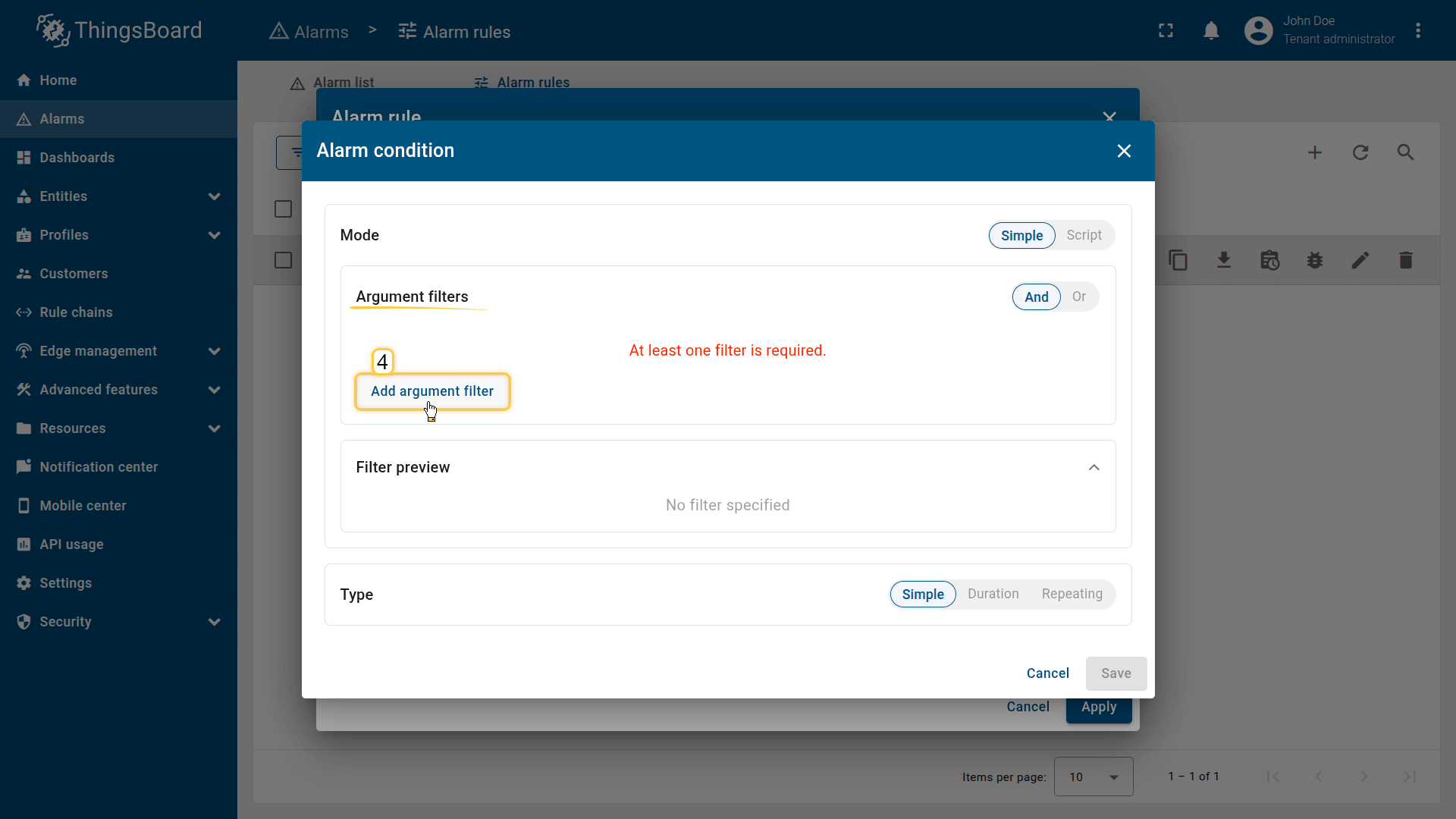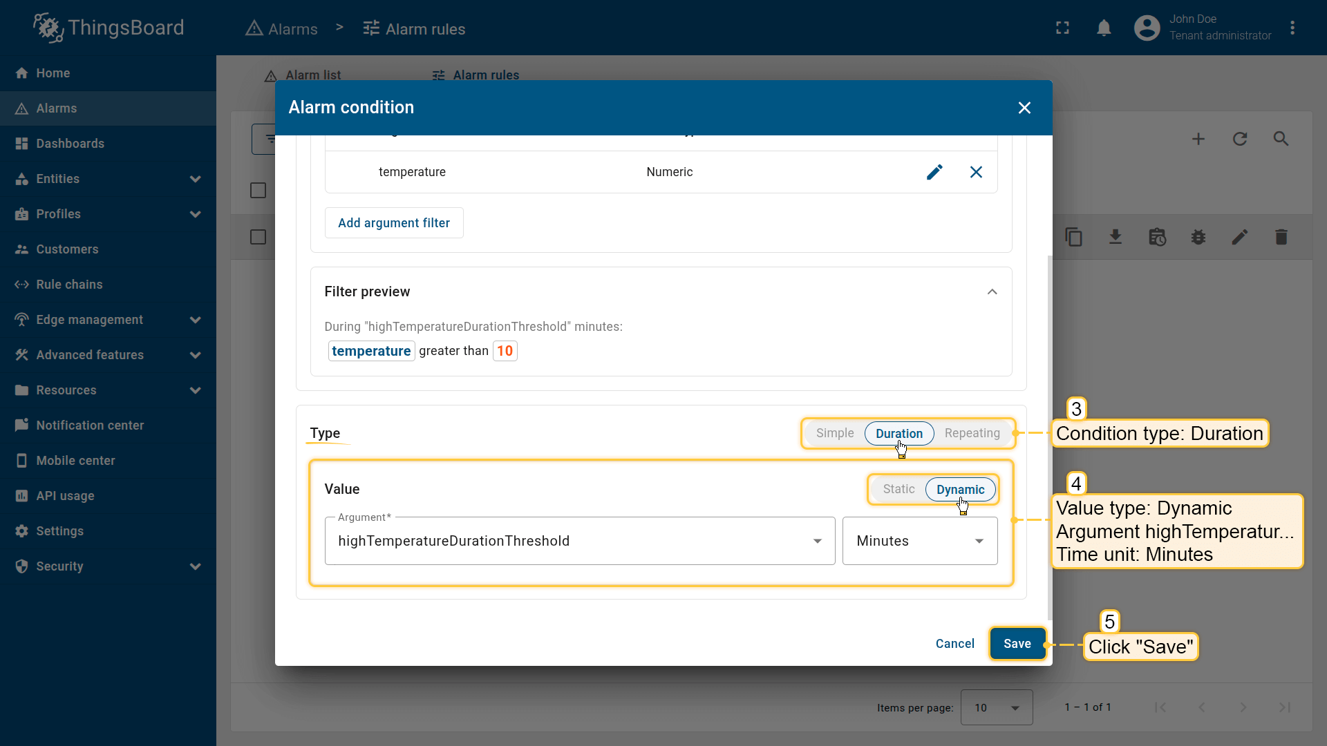 Note: The process of creating an alarm rule is the same for Devices, Assets, Device profiles, Asset profiles, or Customers.