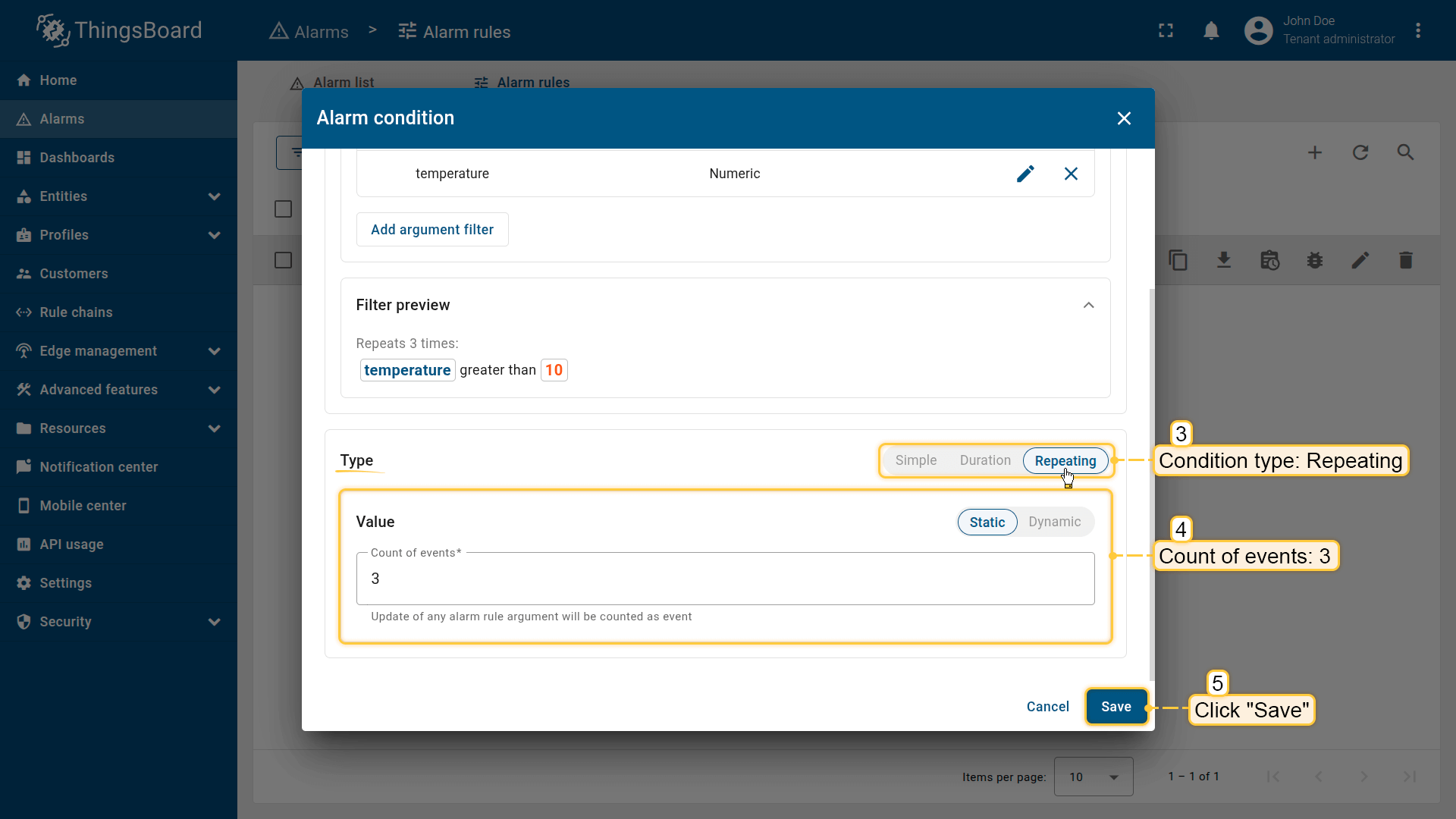 With this configuration, ThingsBoard will check whether the threshold condition occurs three times in a row before creating the alarm.