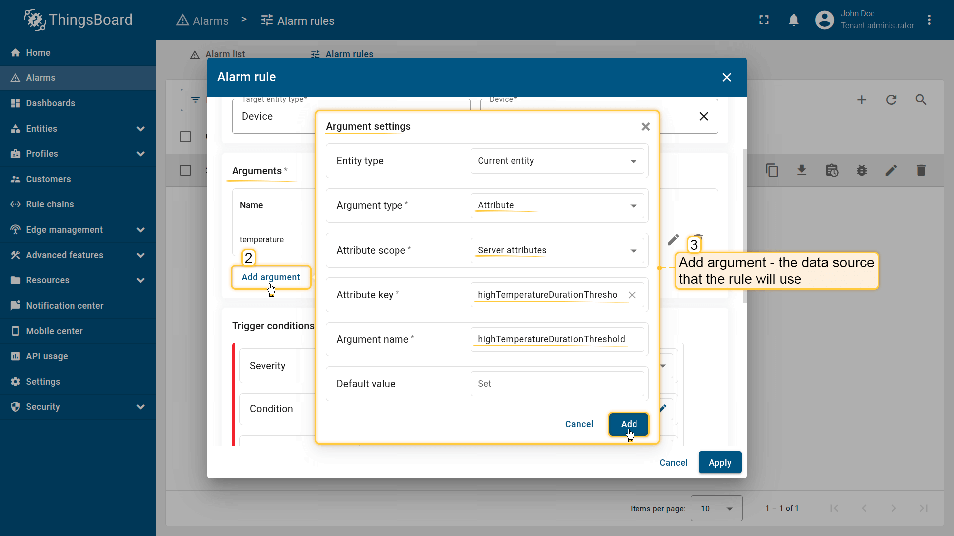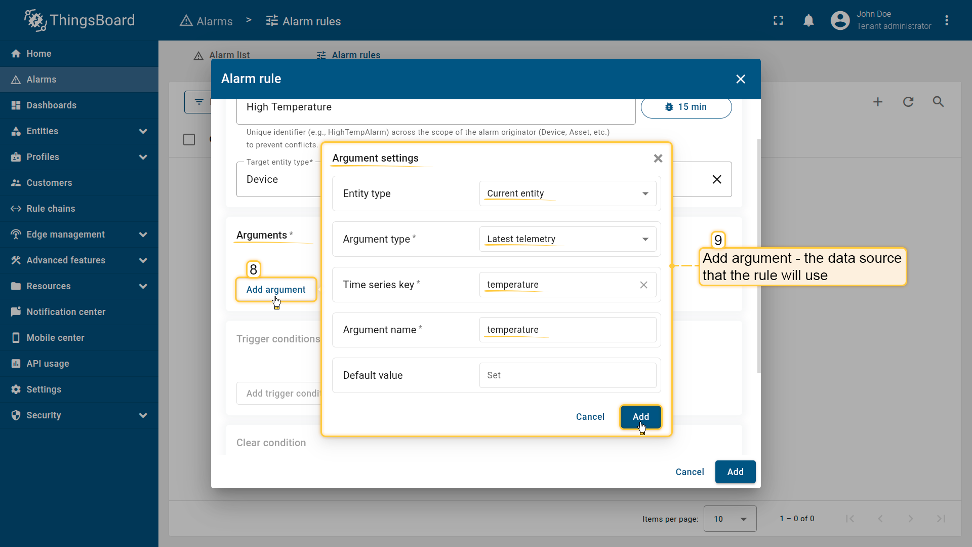 Before defining alarm conditions, you must add at least one argument — a data source that the rule will use during evaluation.